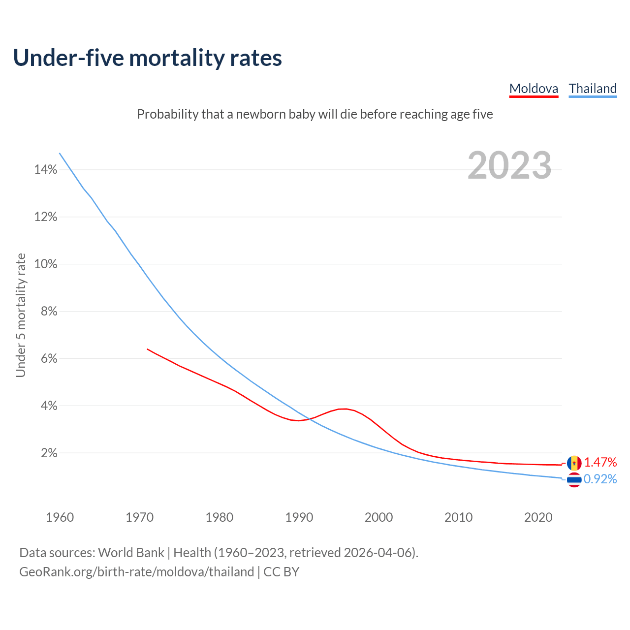 The chance that a newborn baby will die before reaching age five is 1.47% in Moldova and 0.92% in Thailand. Above is a chart with historical data on under-five mortality rates.