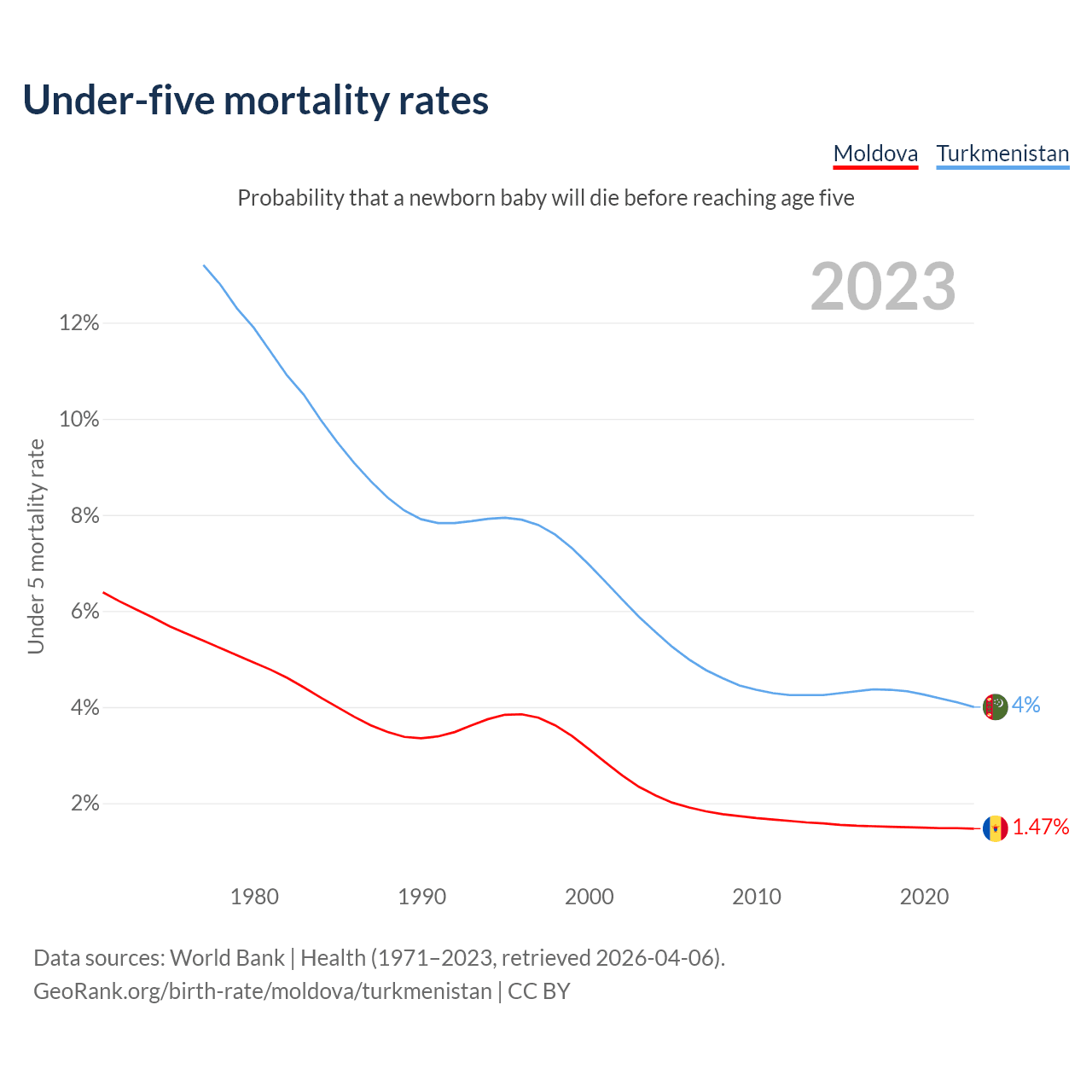 The chance that a newborn baby will die before reaching age five is 1.47% in Moldova and 4% in Turkmenistan. Above is a chart with historical data on under-five mortality rates.