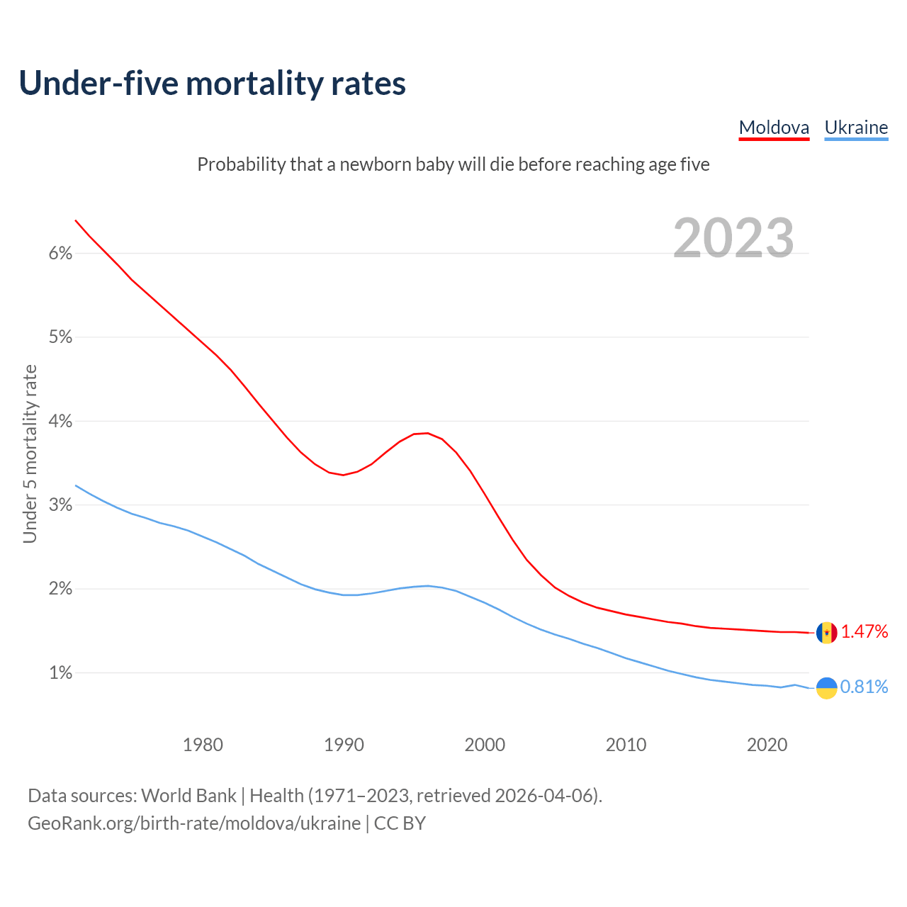 The chance that a newborn baby will die before reaching age five is 1.47% in Moldova and 0.81% in Ukraine. Above is a chart with historical data on under-five mortality rates.