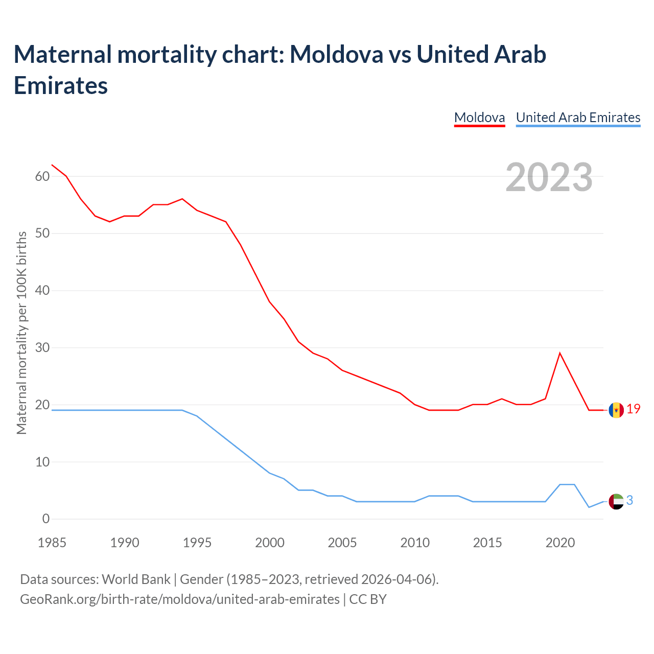The maternal mortality rate, which is the probability of dying during childbirth or within 42 days of pregnancy termination, is 19 deaths per 100,000 live births in Moldova, compared to 3 deaths in the United Arab Emirates.
