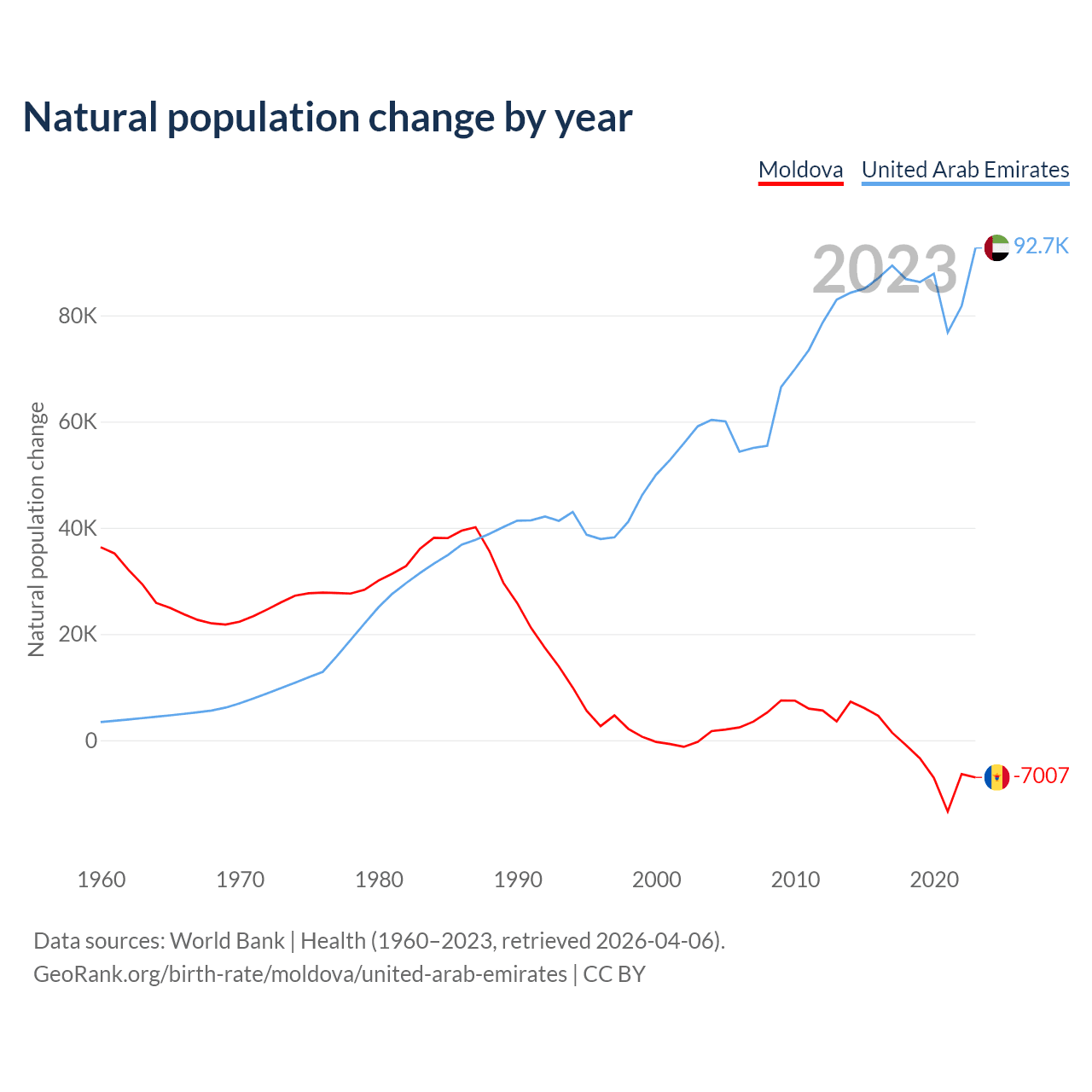 Moldova has an annual birth rate of 10.8 births per 1,000 people, compared to 9.77 for the United Arab Emirates. The average number of children a woman is expected to have during her lifetime — the fertility rate, is 1.73 in Moldova and 1.2 in the United Arab Emirates — 30.7% difference.