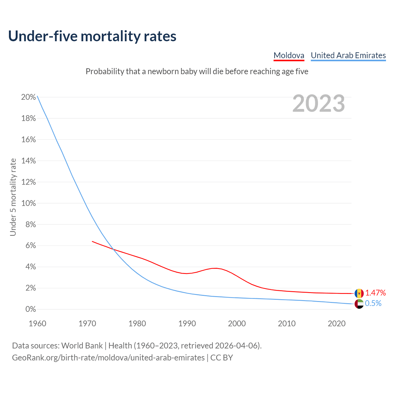 The chance that a newborn baby will die before reaching age five is 1.47% in Moldova and 0.5% in the United Arab Emirates. Above is a chart with historical data on under-five mortality rates.