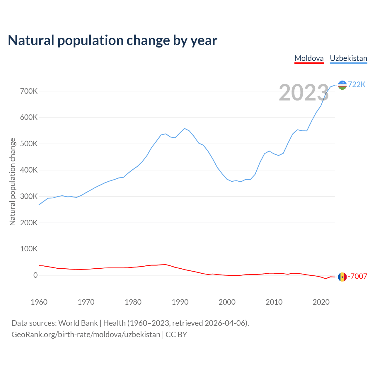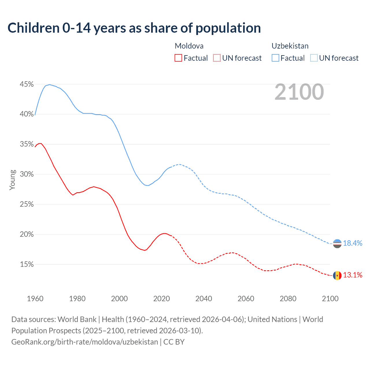 Moldova has an annual birth rate of 10.8 births per 1,000 people, compared to 26.5 for Uzbekistan. The average number of children a woman is expected to have during her lifetime — the fertility rate, is 1.73 in Moldova and 3.5 in Uzbekistan — 102.2% difference.