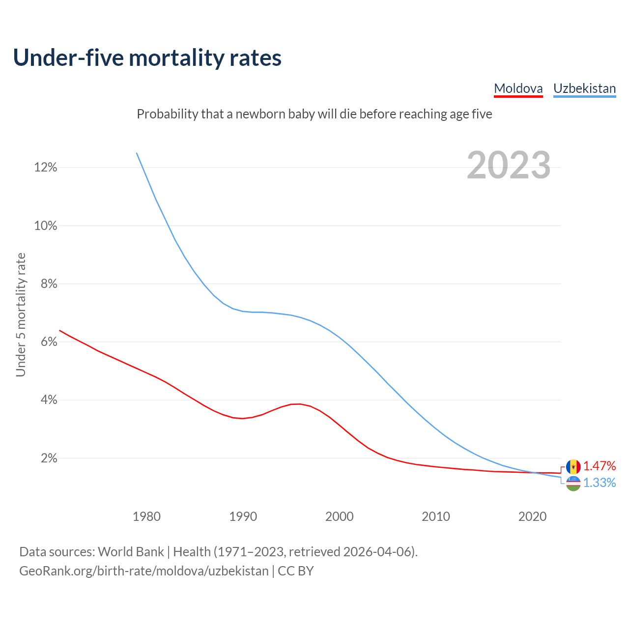 The chance that a newborn baby will die before reaching age five is 1.47% in Moldova and 1.33% in Uzbekistan. Above is a chart with historical data on under-five mortality rates.