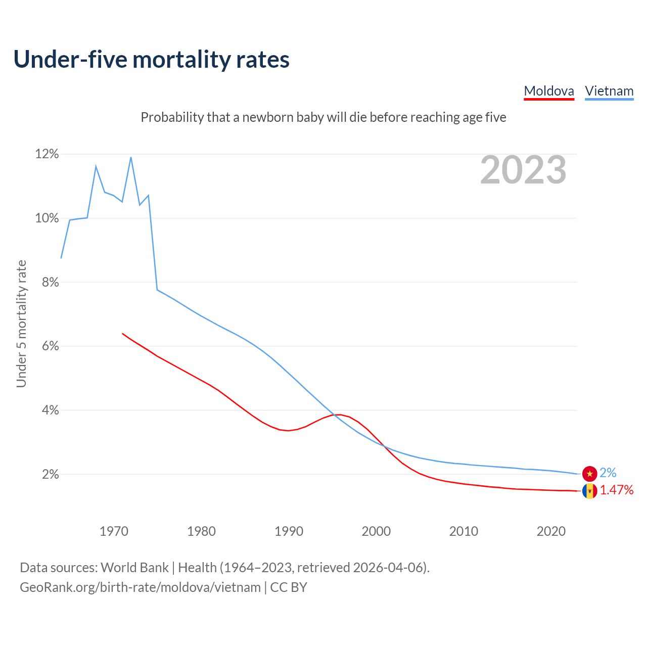 The chance that a newborn baby will die before reaching age five is 1.47% in Moldova and 2% in Vietnam. Above is a chart with historical data on under-five mortality rates.