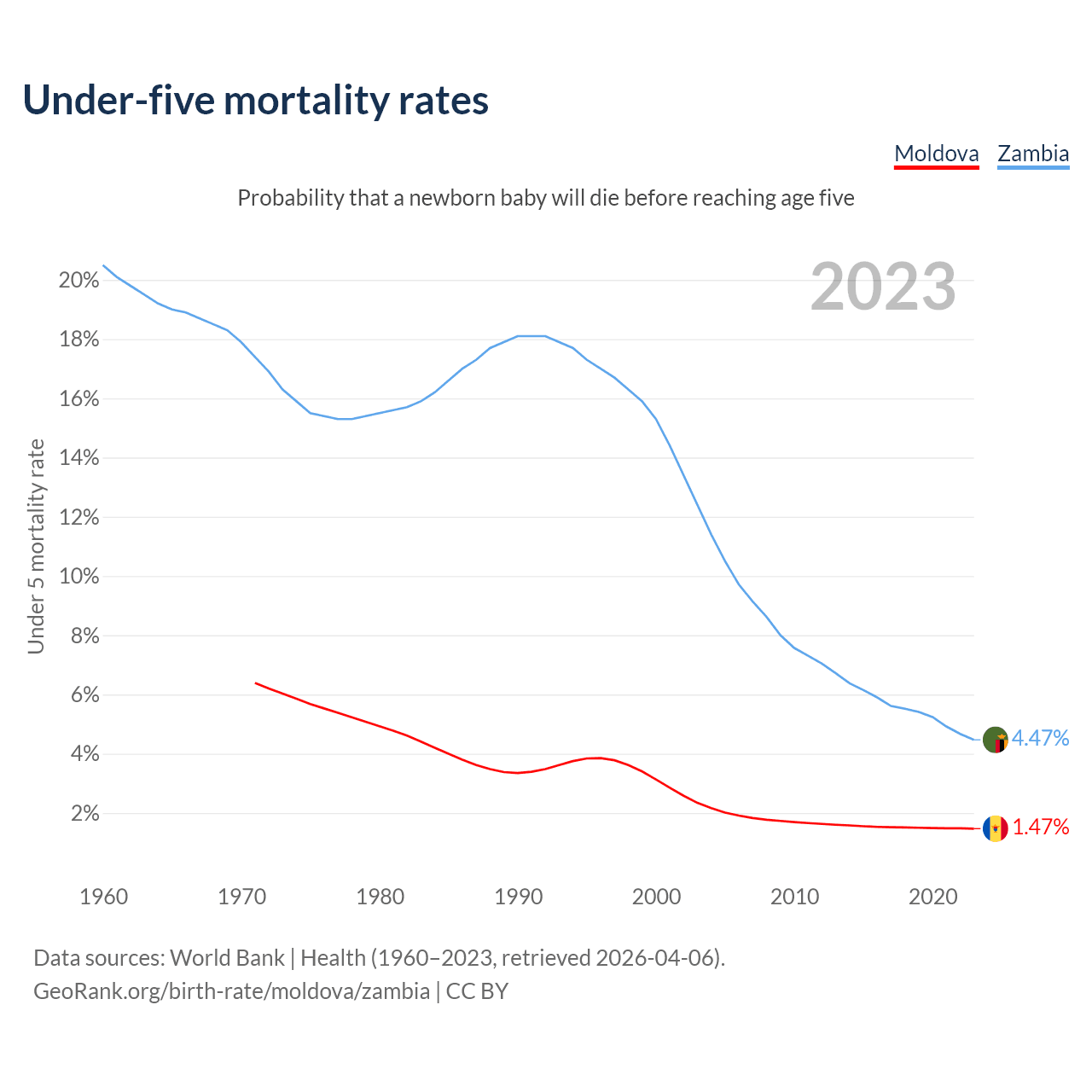 The chance that a newborn baby will die before reaching age five is 1.47% in Moldova and 4.47% in Zambia. Above is a chart with historical data on under-five mortality rates.