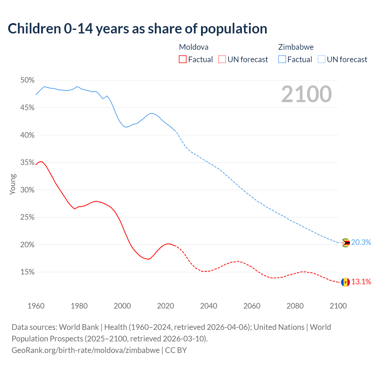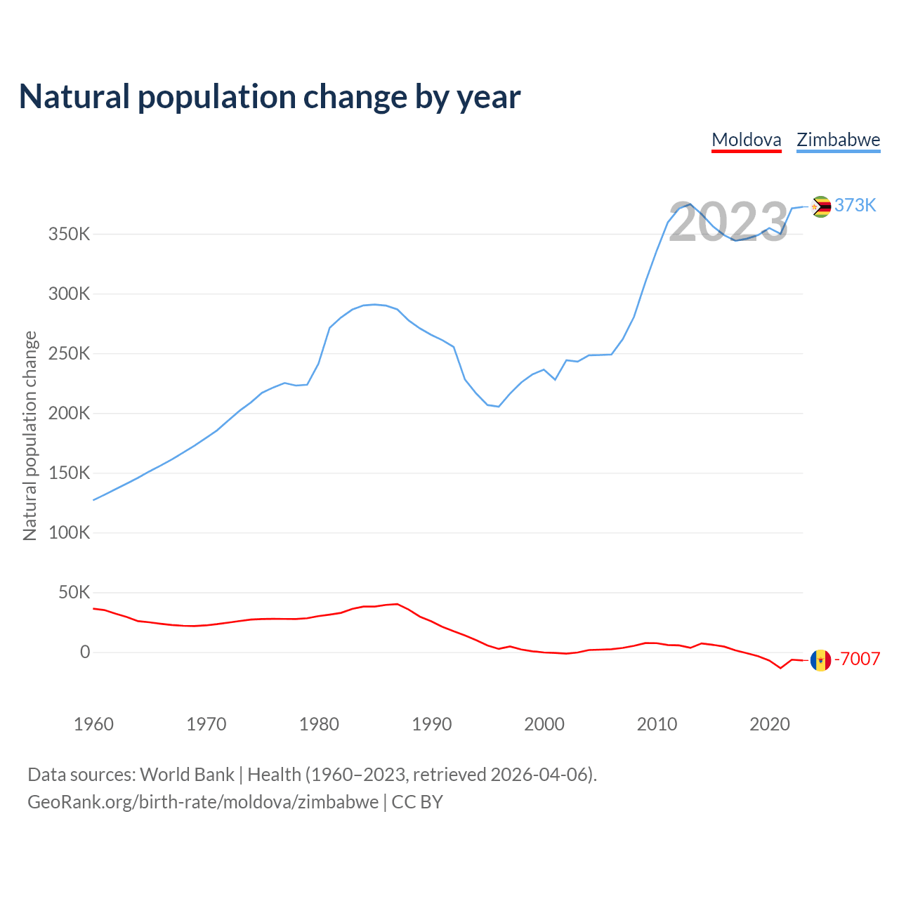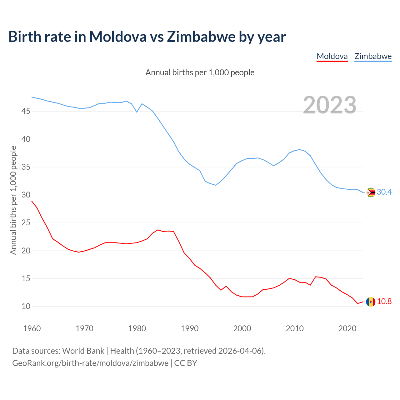 Moldova has an annual birth rate of 10.8 births per 1,000 people, compared to 30.4 for Zimbabwe. The average number of children a woman is expected to have during her lifetime — the fertility rate, is 1.73 in Moldova and 3.72 in Zimbabwe — 115.1% difference.