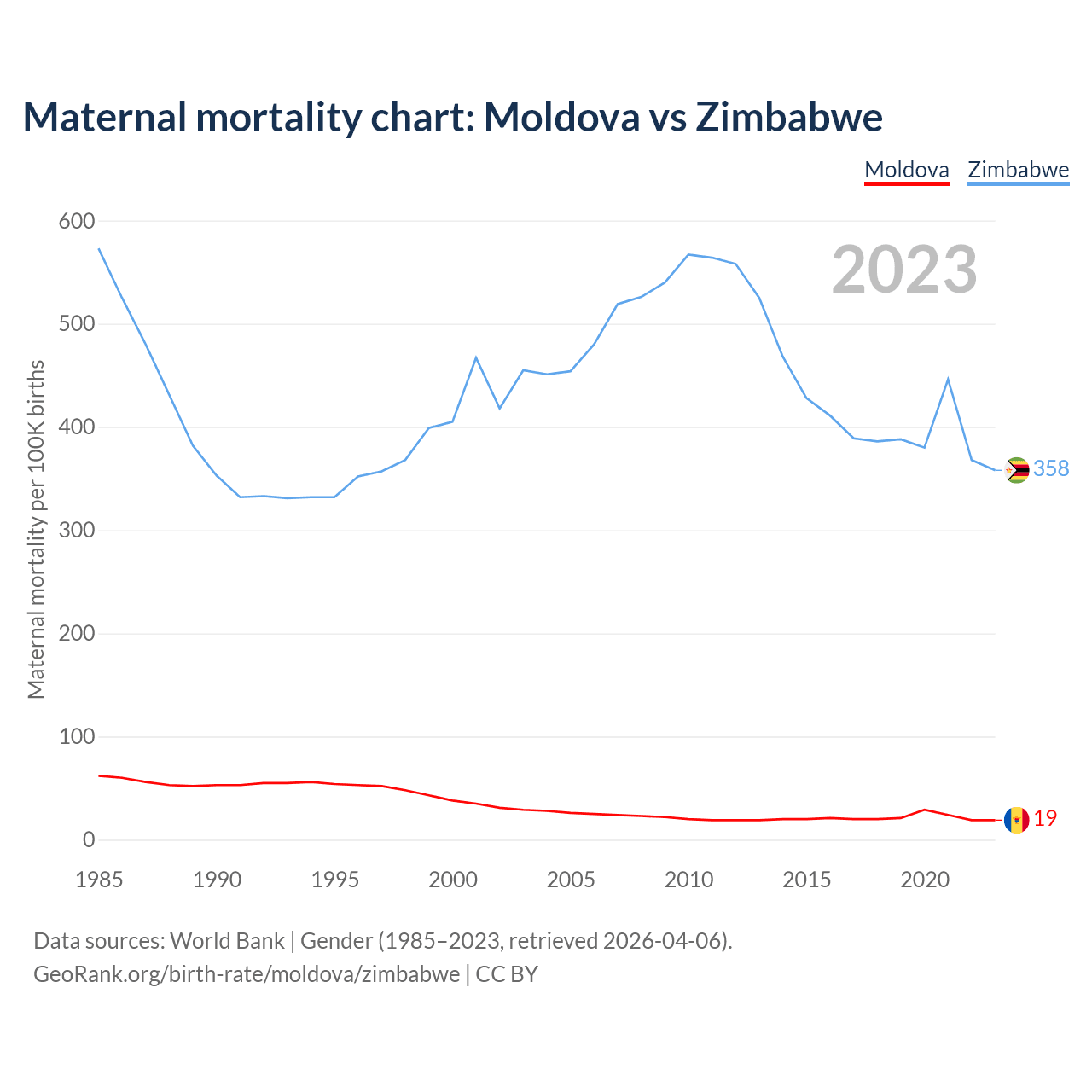 The maternal mortality rate, which is the probability of dying during childbirth or within 42 days of pregnancy termination, is 19 deaths per 100,000 live births in Moldova, compared to 358 deaths in Zimbabwe.