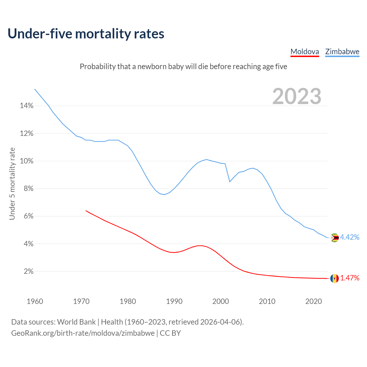 The chance that a newborn baby will die before reaching age five is 1.47% in Moldova and 4.42% in Zimbabwe. Above is a chart with historical data on under-five mortality rates.