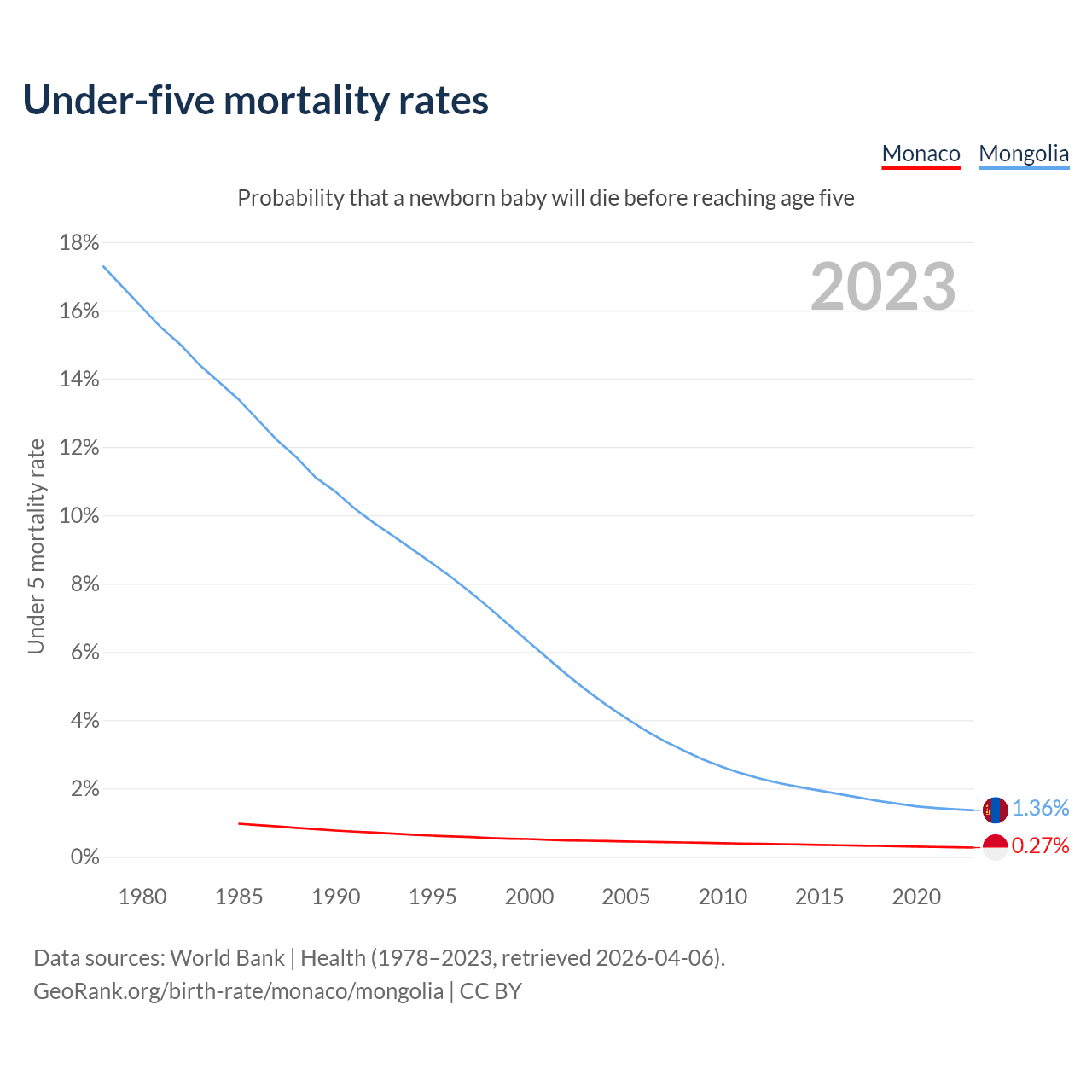 The chance that a newborn baby will die before reaching age five is 0.27% in Monaco and 1.36% in Mongolia. Above is a chart with historical data on under-five mortality rates.