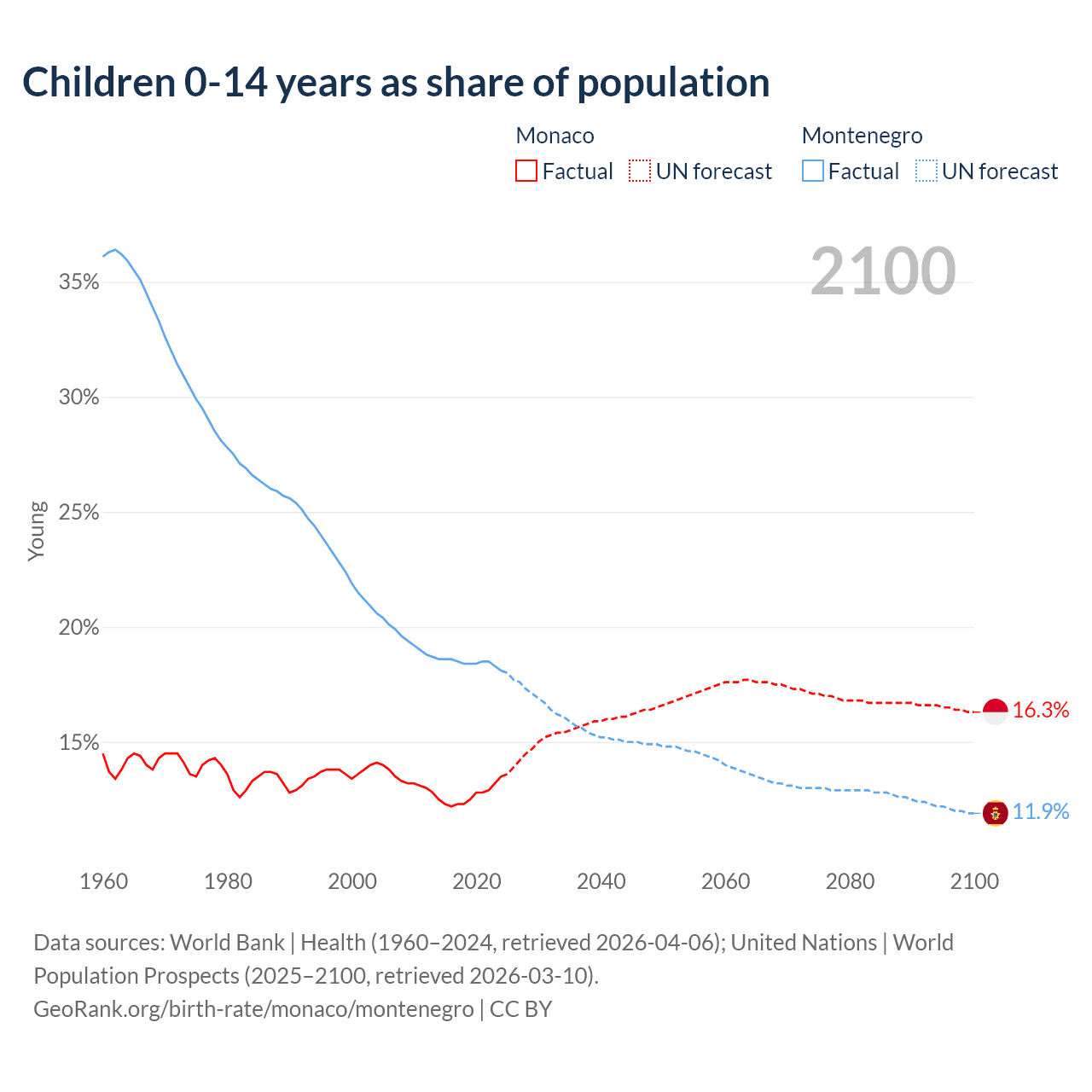 Children aged 0-14 make up 13.5% of the population in Monaco and 18.1% in Montenegro in 2024, compared to 12.8% and 25.6% respectively in 1990.