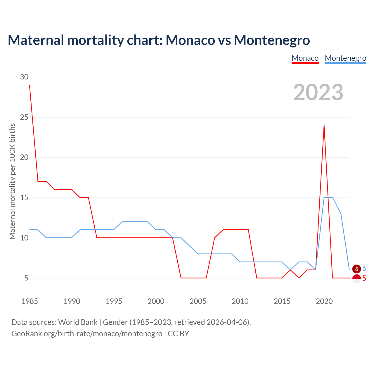 The maternal mortality rate, which is the probability of dying during childbirth or within 42 days of pregnancy termination, is 5 deaths per 100,000 live births in Monaco, compared to 6 deaths in Montenegro.
