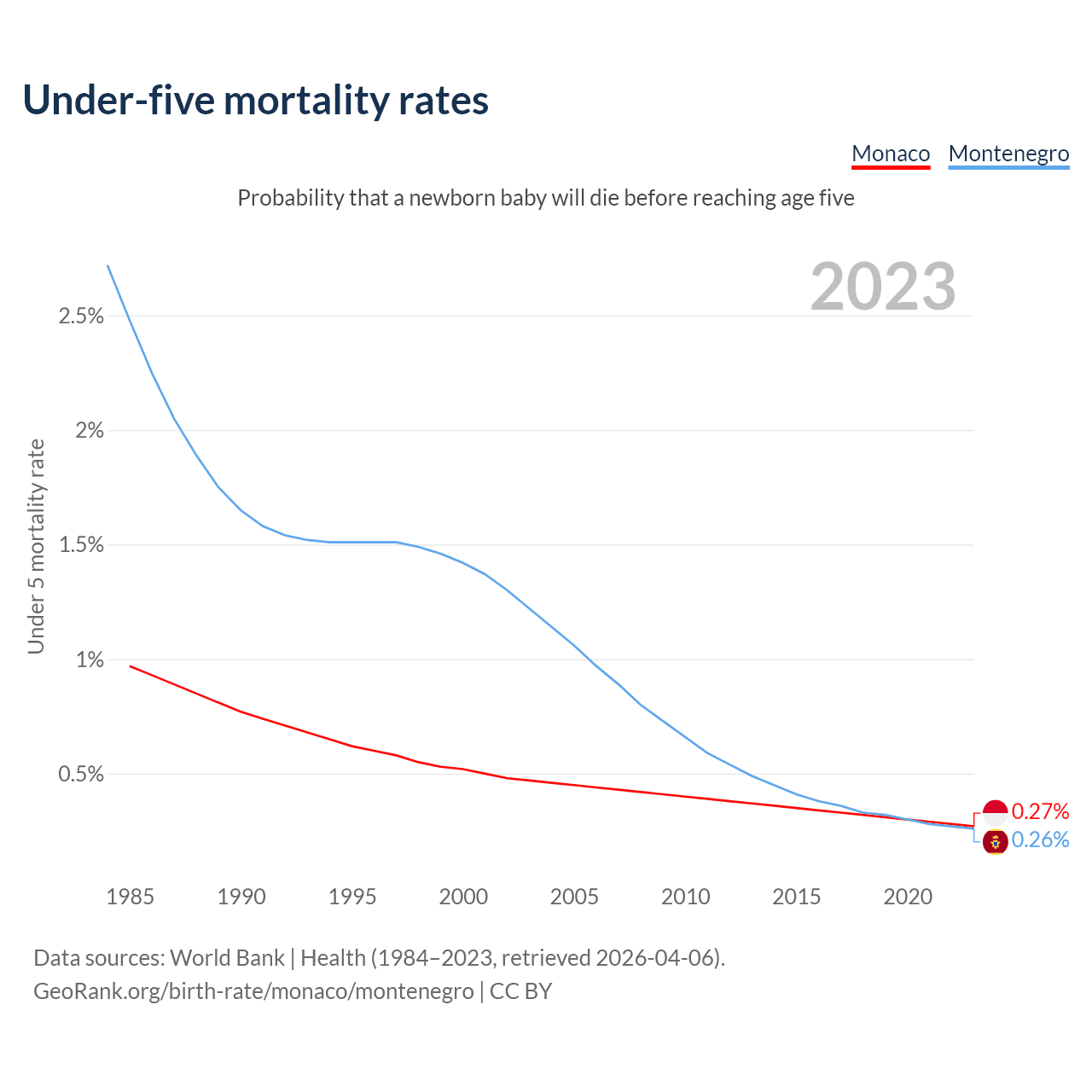 The chance that a newborn baby will die before reaching age five is 0.27% in Monaco and 0.26% in Montenegro. Above is a chart with historical data on under-five mortality rates.