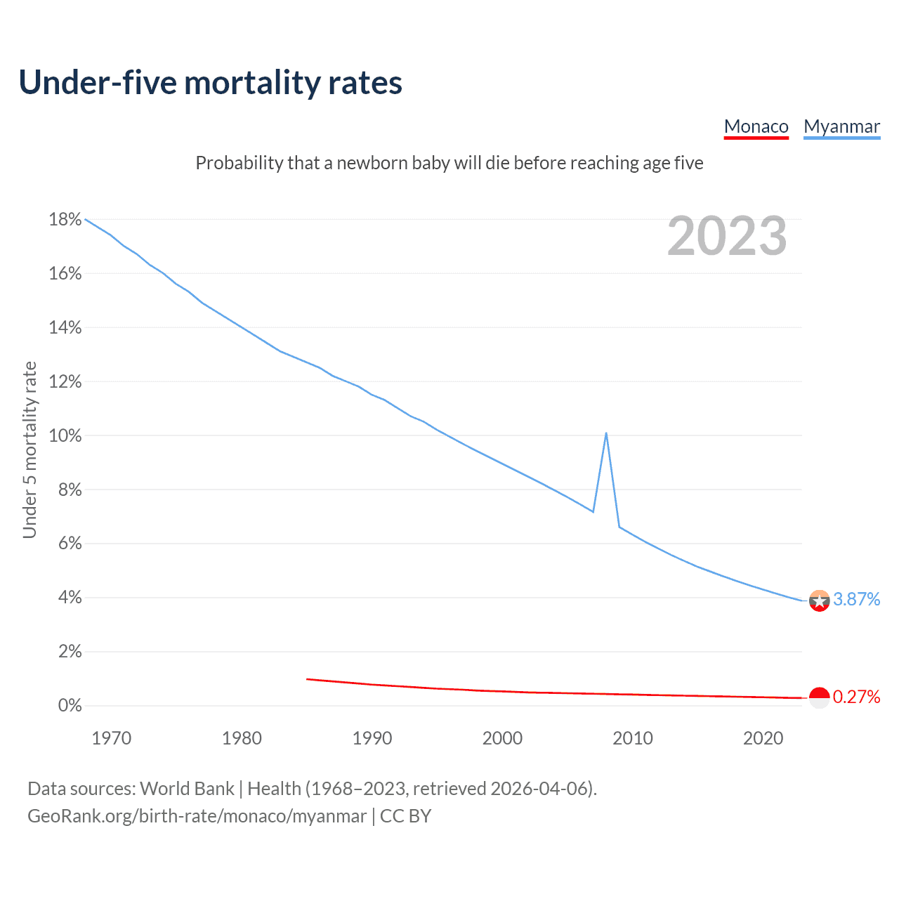 The chance that a newborn baby will die before reaching age five is 0.27% in Monaco and 3.87% in Myanmar. Above is a chart with historical data on under-five mortality rates.