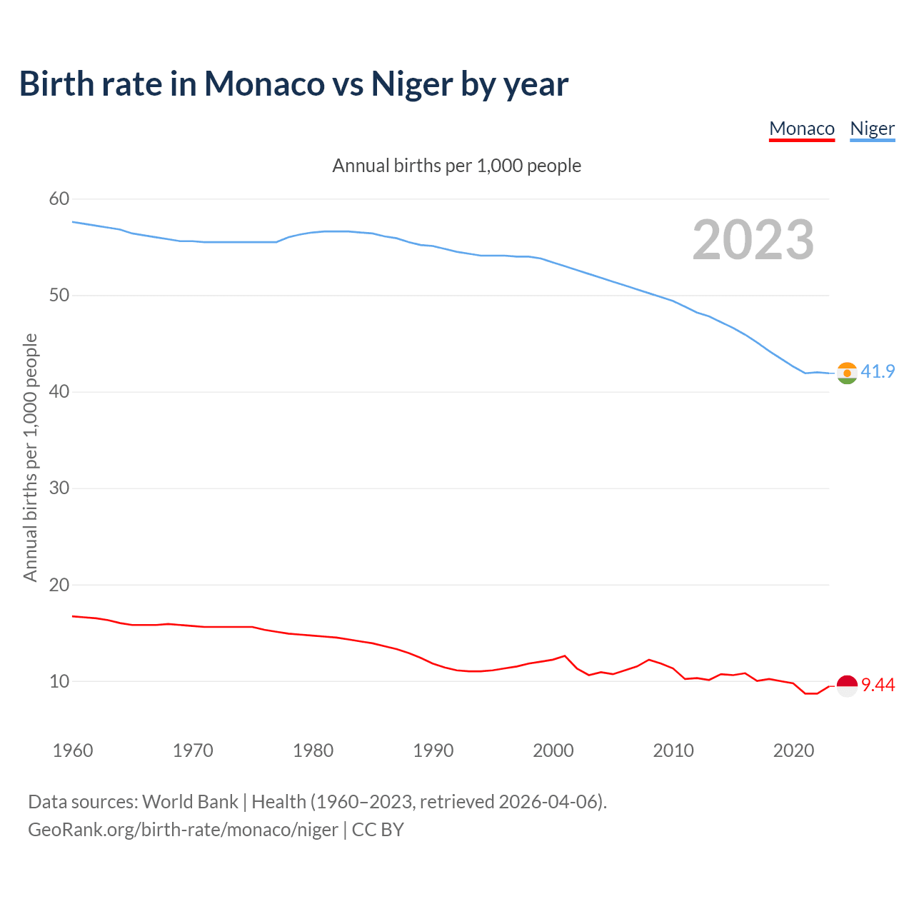 Monaco has an annual birth rate of 9.44 births per 1,000 people, compared to 41.9 for Niger. The average number of children a woman is expected to have during her lifetime — the fertility rate, is 2.11 in Monaco and 6.06 in Niger — 187.3% difference.