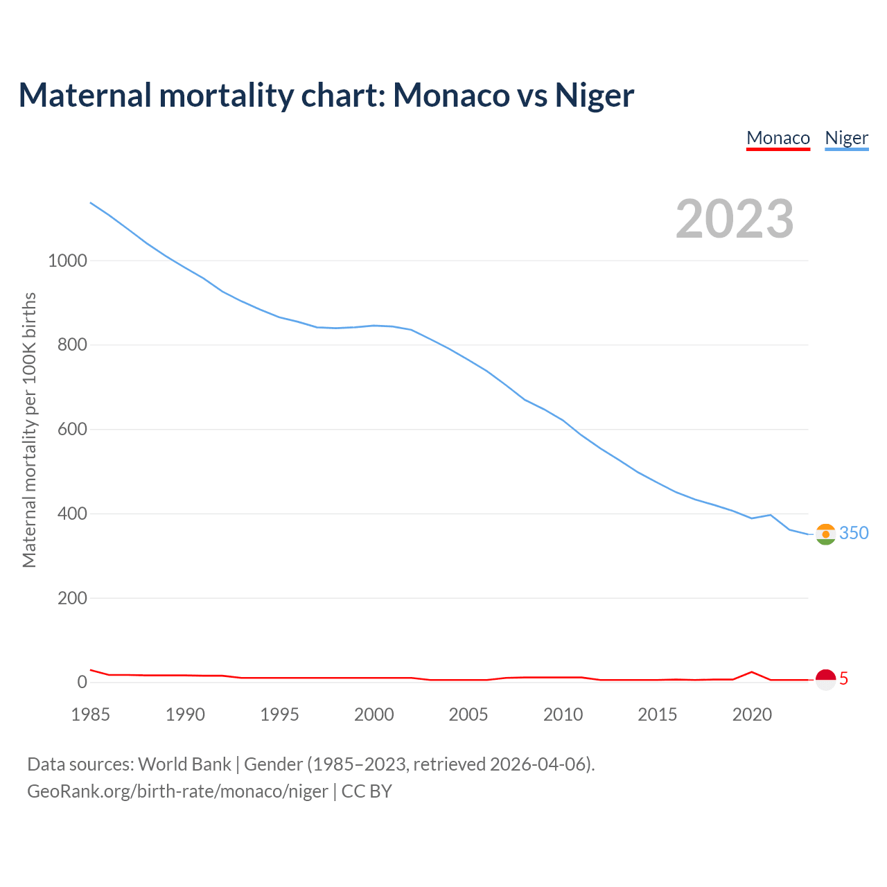 The maternal mortality rate, which is the probability of dying during childbirth or within 42 days of pregnancy termination, is 5 deaths per 100,000 live births in Monaco, compared to 350 deaths in Niger.