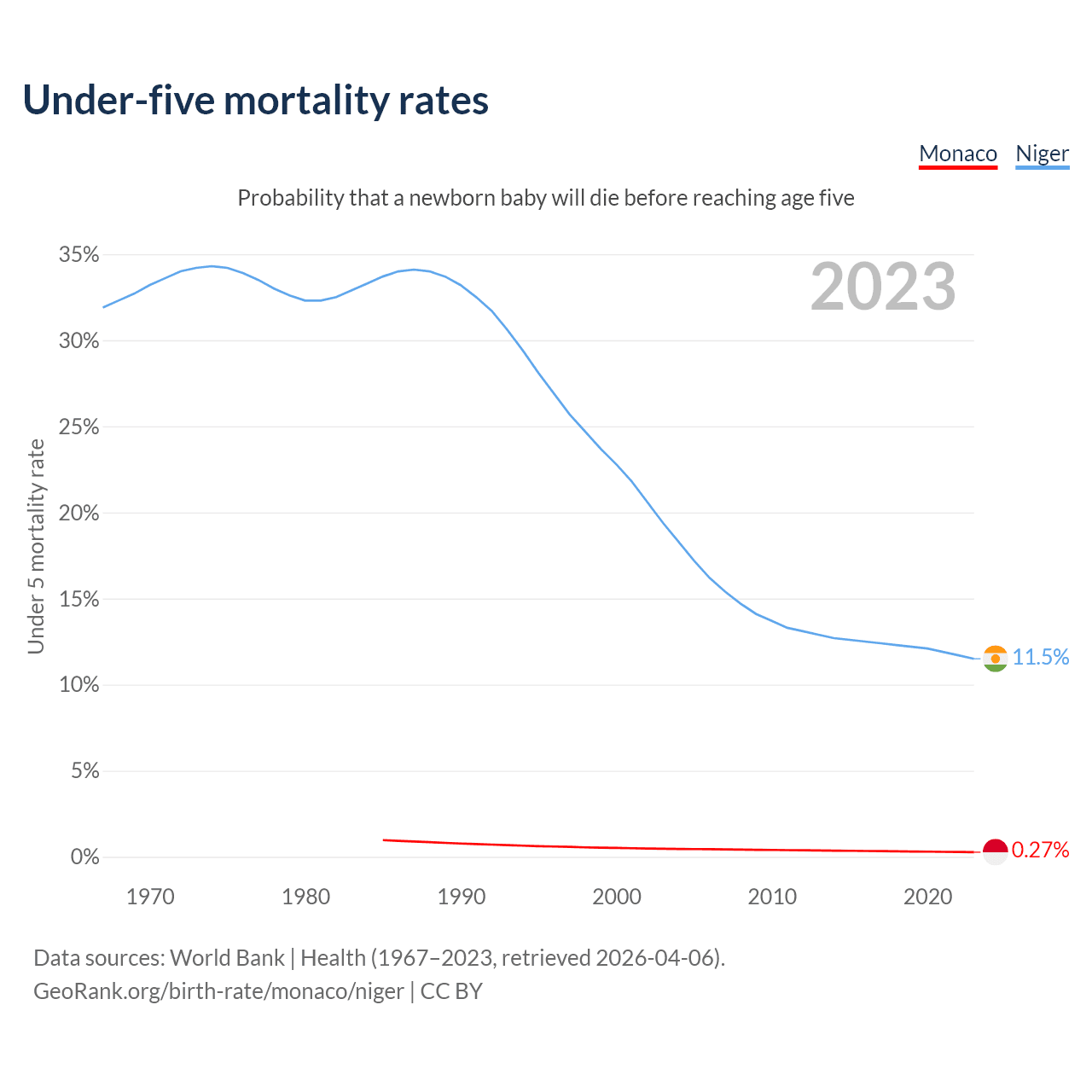 The chance that a newborn baby will die before reaching age five is 0.27% in Monaco and 11.5% in Niger. Above is a chart with historical data on under-five mortality rates.