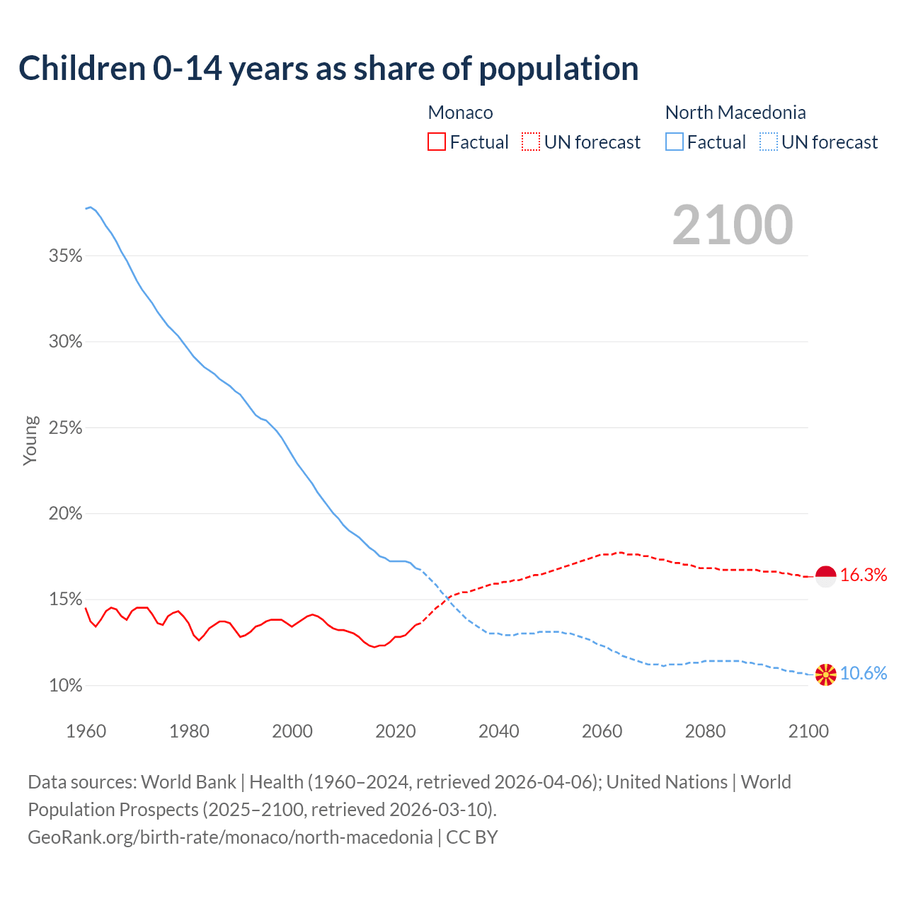 According to the latest available data on birth rates, the fertility rate in Monaco was 2.11 children per woman in 2023, compared to 1.5 in North Macedonia in 2023. The replacement level is considered to be 2.1 children per woman.