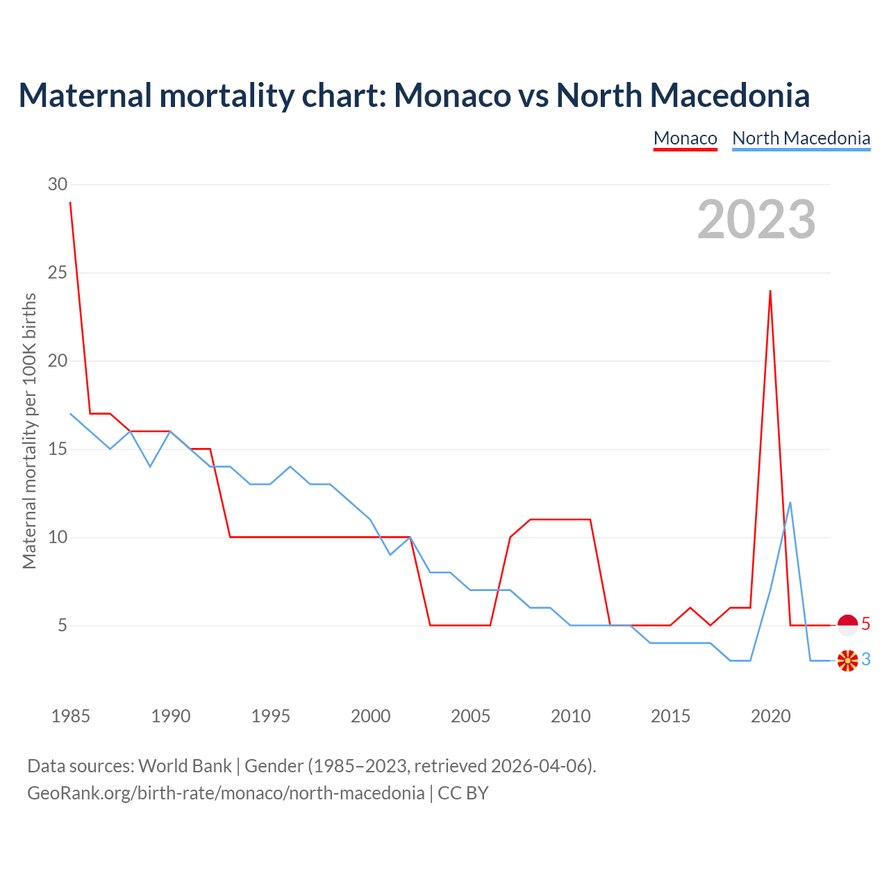 The maternal mortality rate, which is the probability of dying during childbirth or within 42 days of pregnancy termination, is 5 deaths per 100,000 live births in Monaco, compared to 3 deaths in North Macedonia.