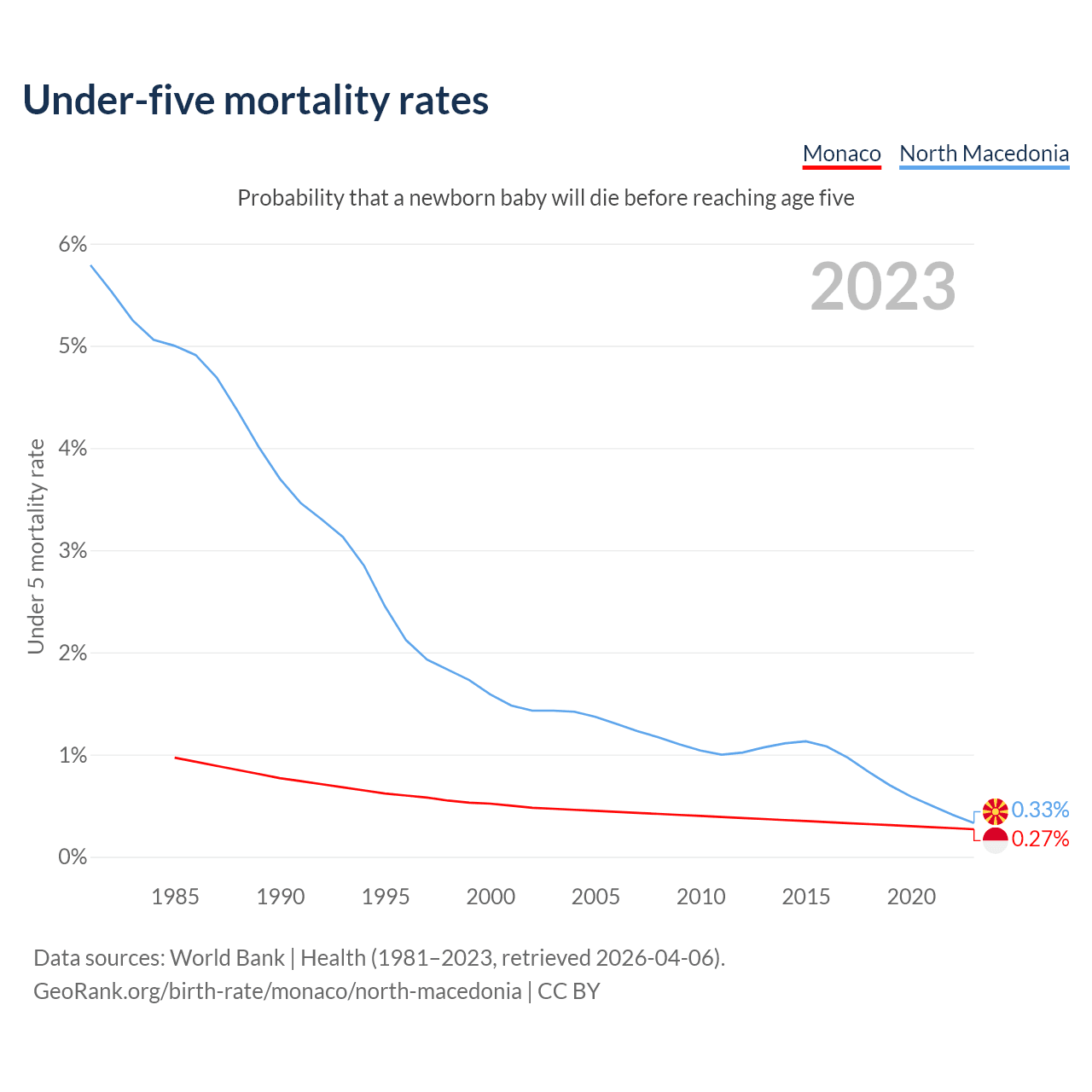 The chance that a newborn baby will die before reaching age five is 0.27% in Monaco and 0.33% in North Macedonia. Above is a chart with historical data on under-five mortality rates.