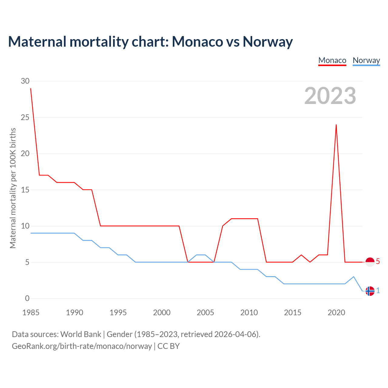 The maternal mortality rate, which is the probability of dying during childbirth or within 42 days of pregnancy termination, is 5 deaths per 100,000 live births in Monaco, compared to 1 deaths in Norway.