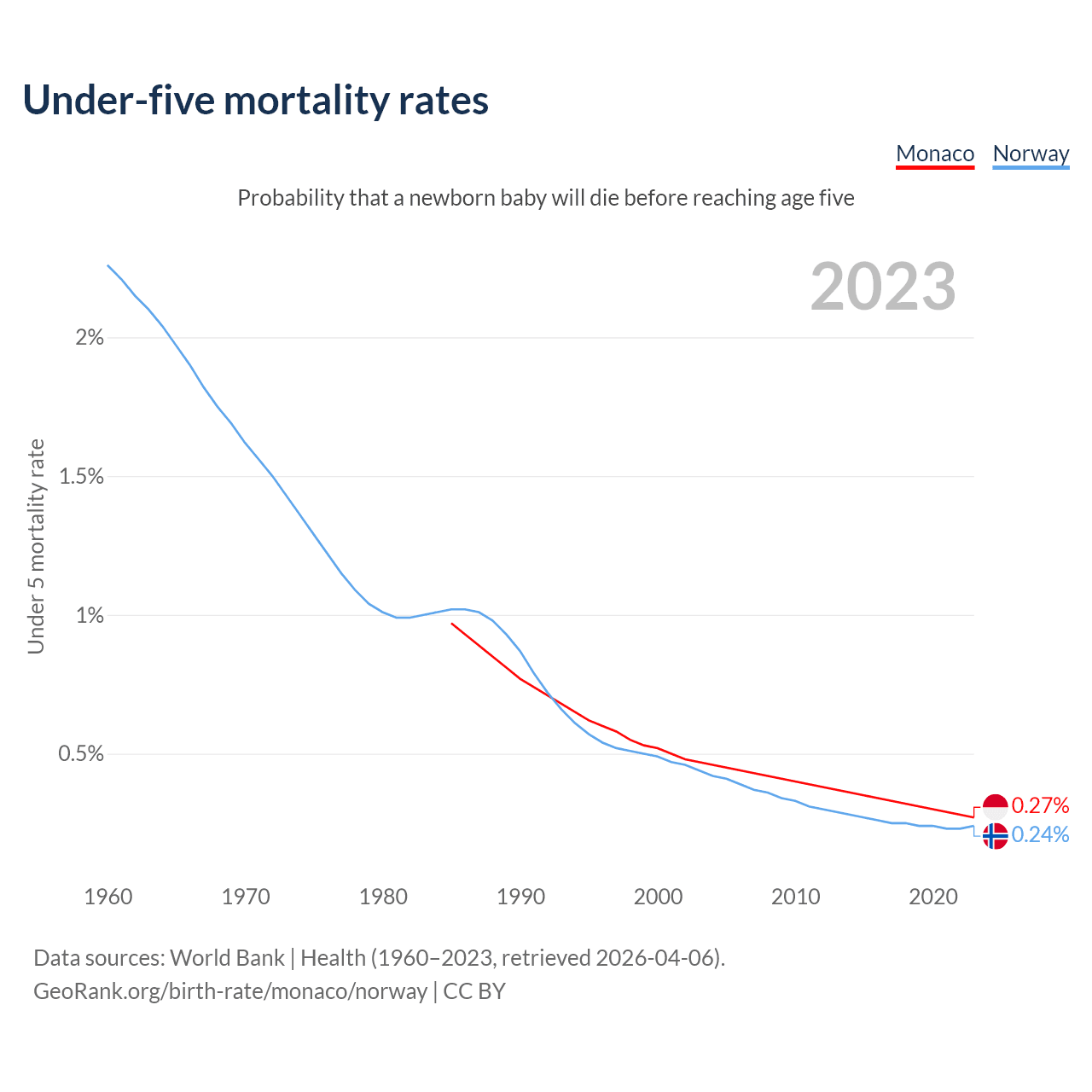 The chance that a newborn baby will die before reaching age five is 0.27% in Monaco and 0.24% in Norway. Above is a chart with historical data on under-five mortality rates.