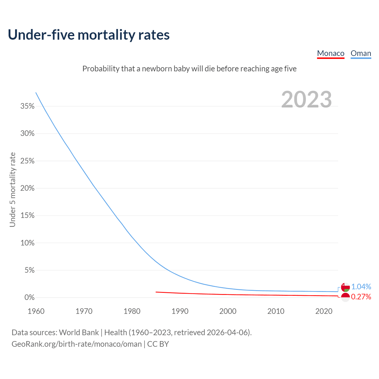 The chance that a newborn baby will die before reaching age five is 0.27% in Monaco and 1.04% in Oman. Above is a chart with historical data on under-five mortality rates.