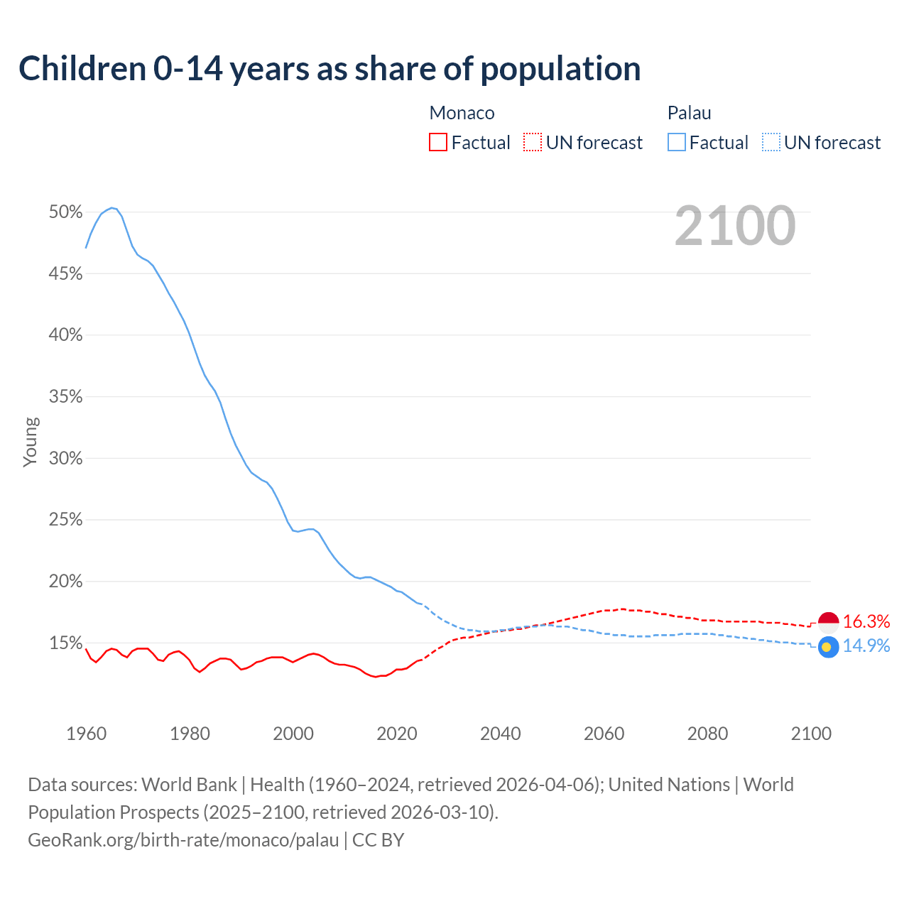 According to the latest available data on birth rates, the fertility rate in Monaco was 2.11 children per woman in 2023, compared to 1.91 in Palau in 2023. The replacement level is considered to be 2.1 children per woman.