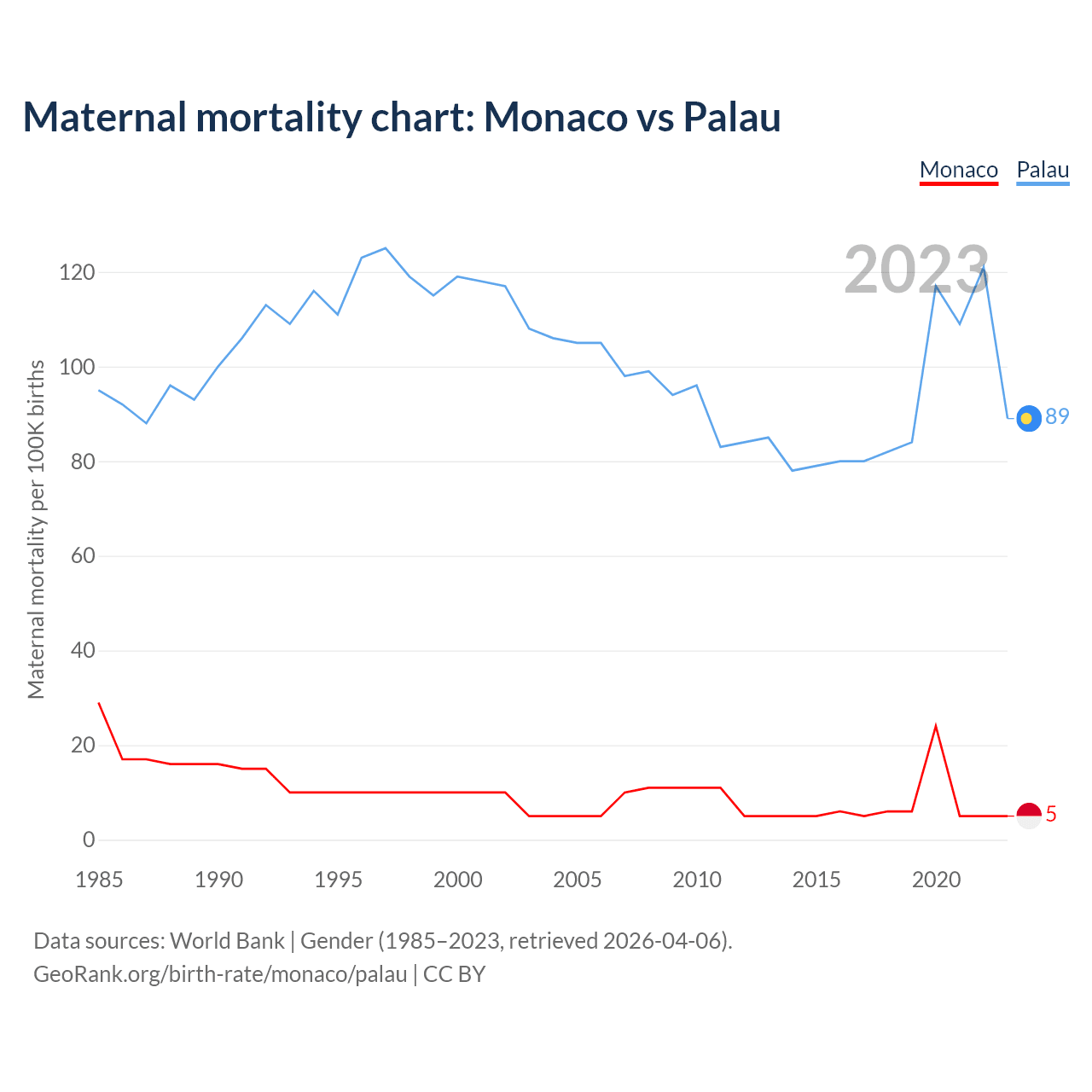 The maternal mortality rate, which is the probability of dying during childbirth or within 42 days of pregnancy termination, is 5 deaths per 100,000 live births in Monaco, compared to 89 deaths in Palau.
