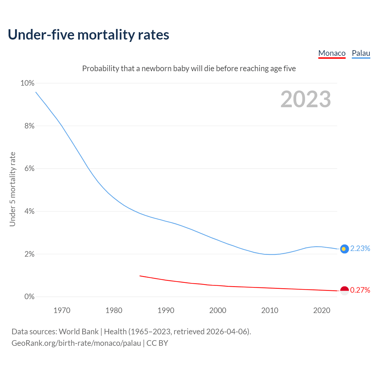 The chance that a newborn baby will die before reaching age five is 0.27% in Monaco and 2.23% in Palau. Above is a chart with historical data on under-five mortality rates.