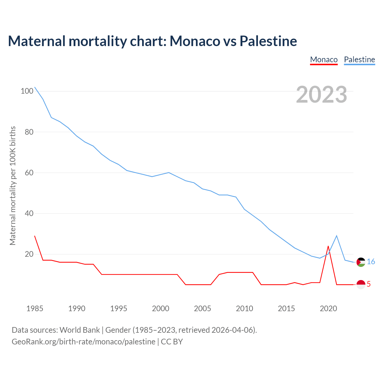 The maternal mortality rate, which is the probability of dying during childbirth or within 42 days of pregnancy termination, is 5 deaths per 100,000 live births in Monaco, compared to 16 deaths in Palestine.