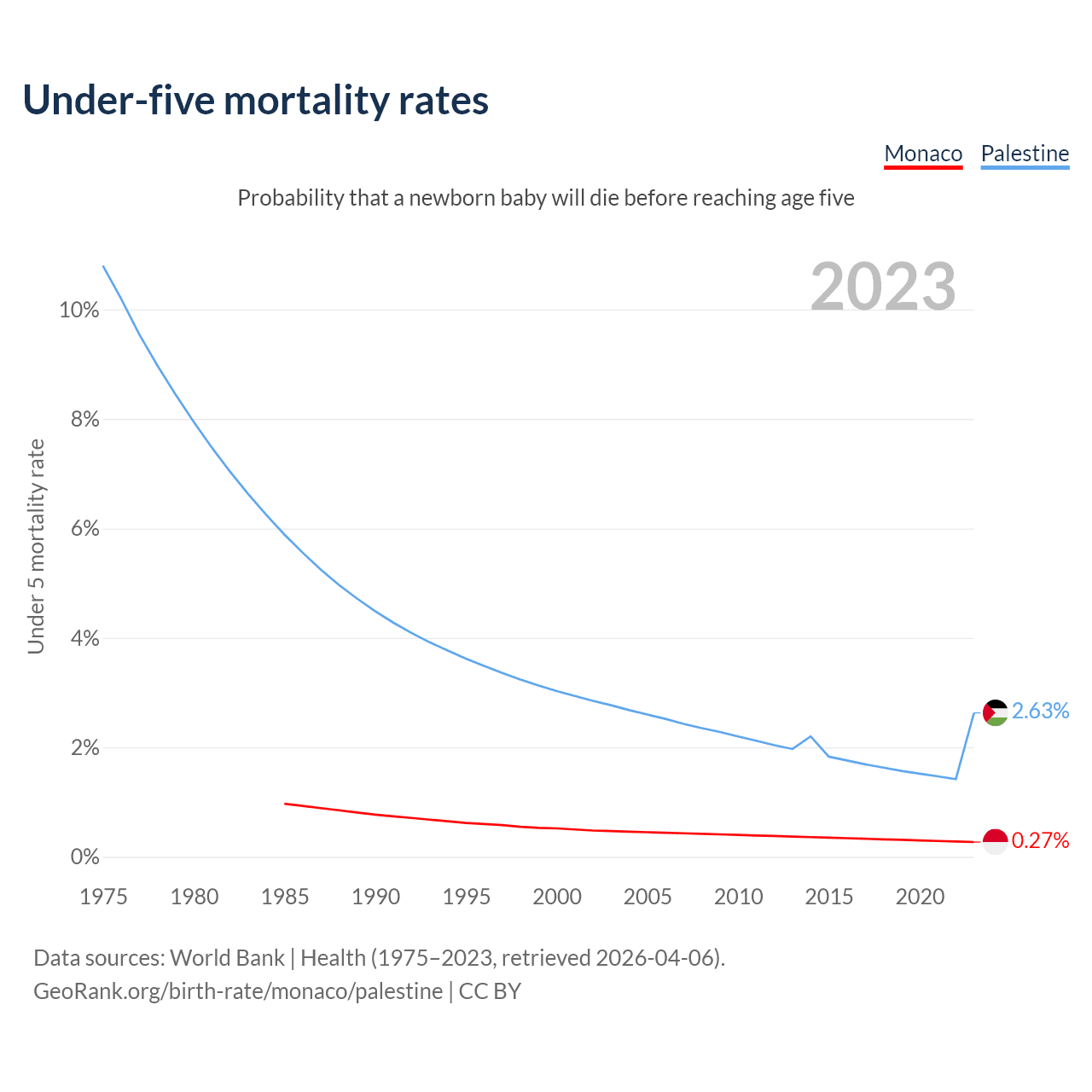 The chance that a newborn baby will die before reaching age five is 0.27% in Monaco and 2.63% in Palestine. Above is a chart with historical data on under-five mortality rates.