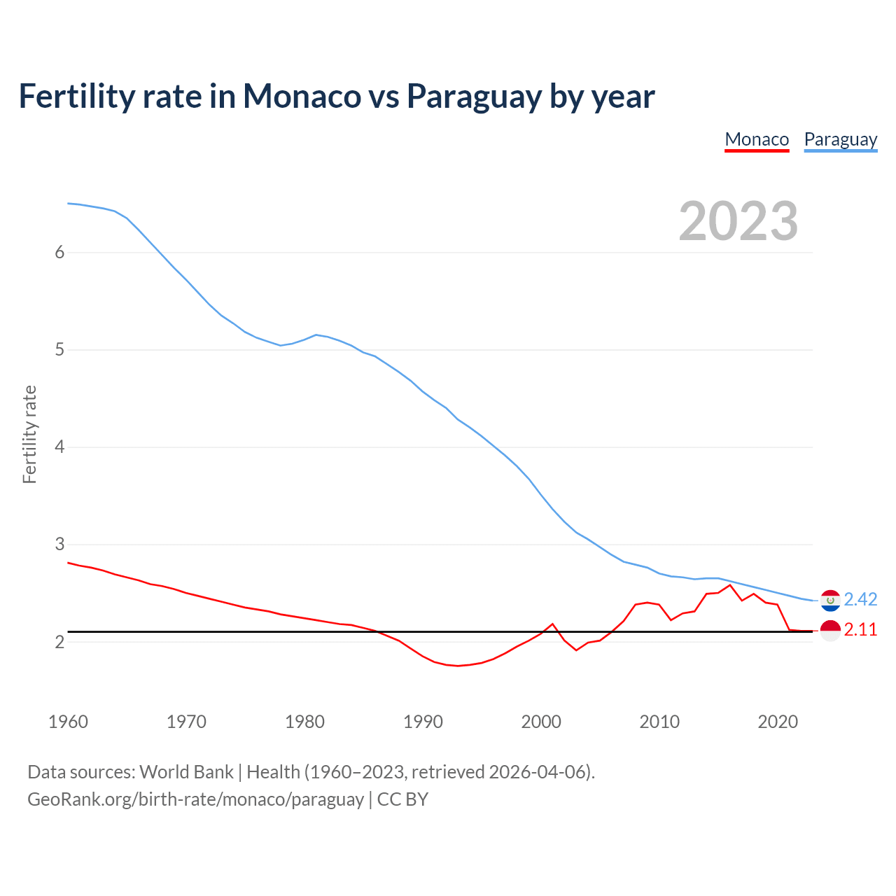 1960 vs 2023, the fertility rate has decreased by 25% in Monaco and by 62.7% in Paraguay — in 1960, it was 2.81 and 6.5, respectively.