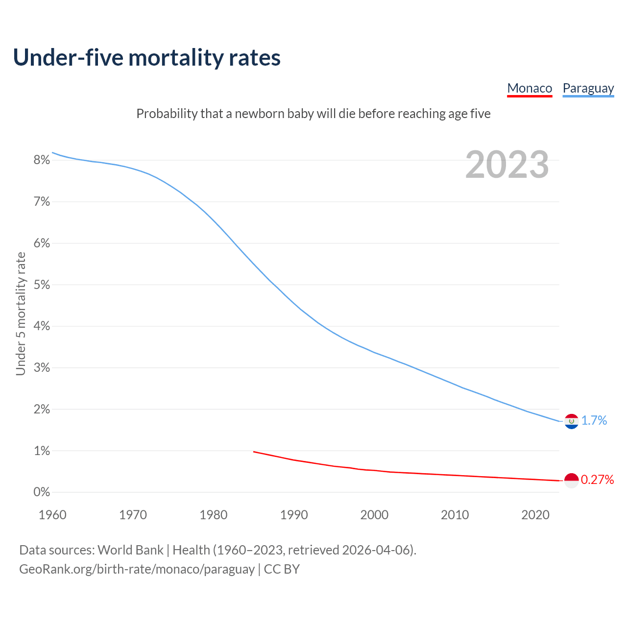 The chance that a newborn baby will die before reaching age five is 0.27% in Monaco and 1.7% in Paraguay. Above is a chart with historical data on under-five mortality rates.
