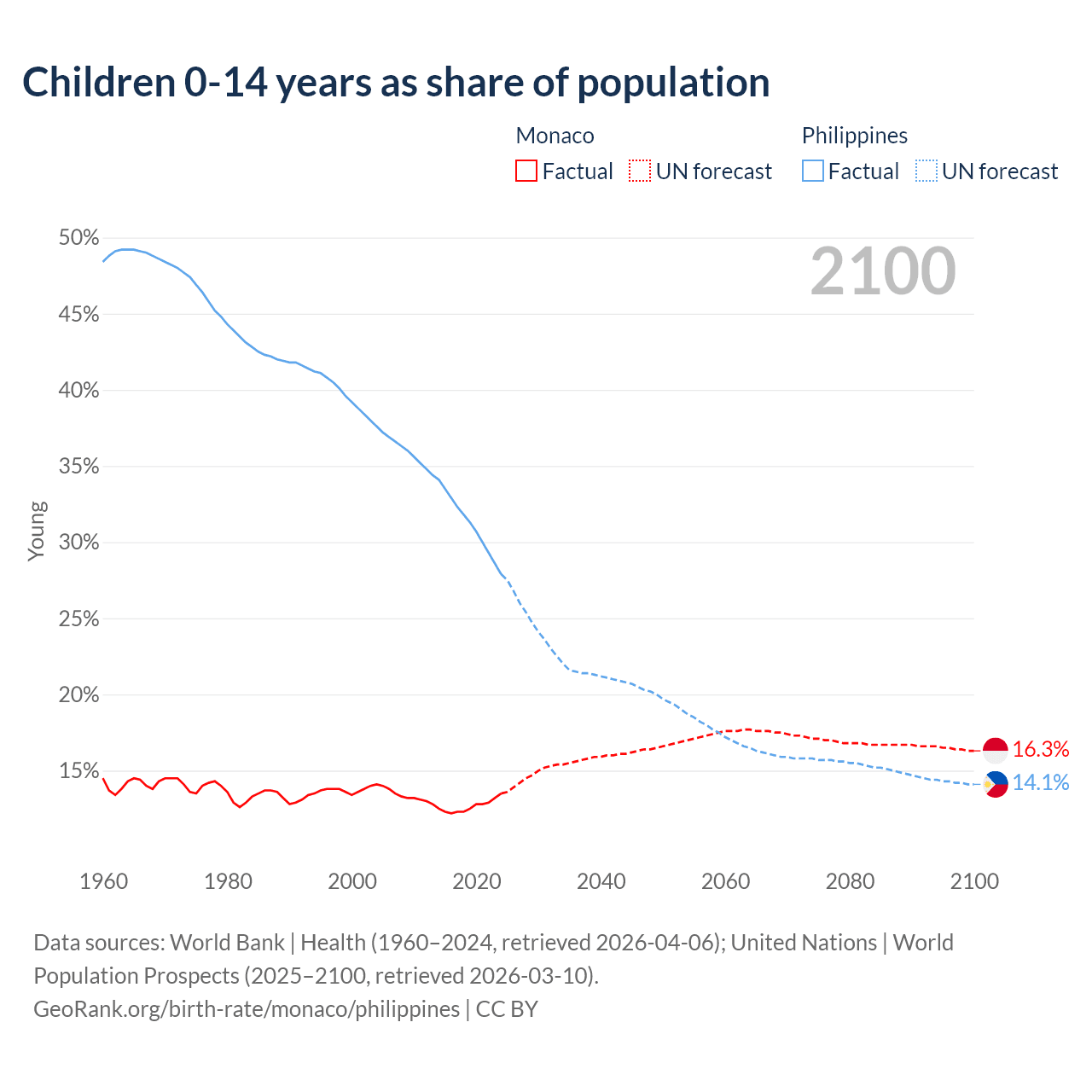 According to the latest available data on birth rates, the fertility rate in Monaco was 2.11 children per woman in 2023, compared to 1.92 in the Philippines in 2023. The replacement level is considered to be 2.1 children per woman.