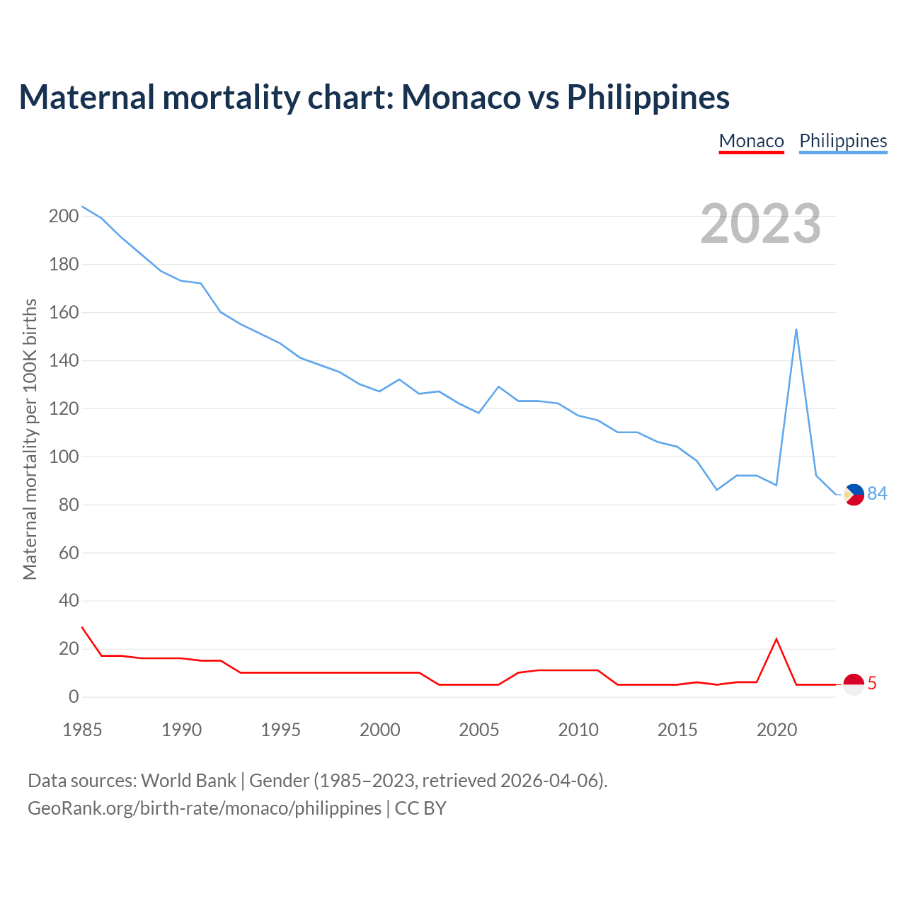 The maternal mortality rate, which is the probability of dying during childbirth or within 42 days of pregnancy termination, is 5 deaths per 100,000 live births in Monaco, compared to 84 deaths in the Philippines.