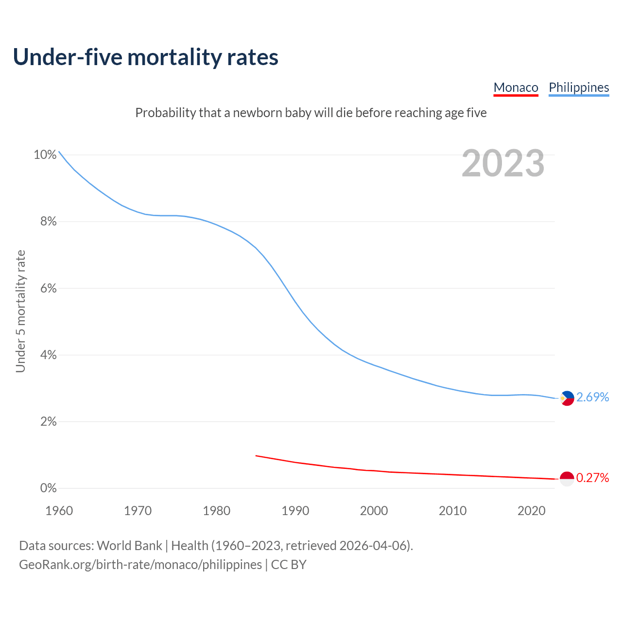 The chance that a newborn baby will die before reaching age five is 0.27% in Monaco and 2.69% in the Philippines. Above is a chart with historical data on under-five mortality rates.