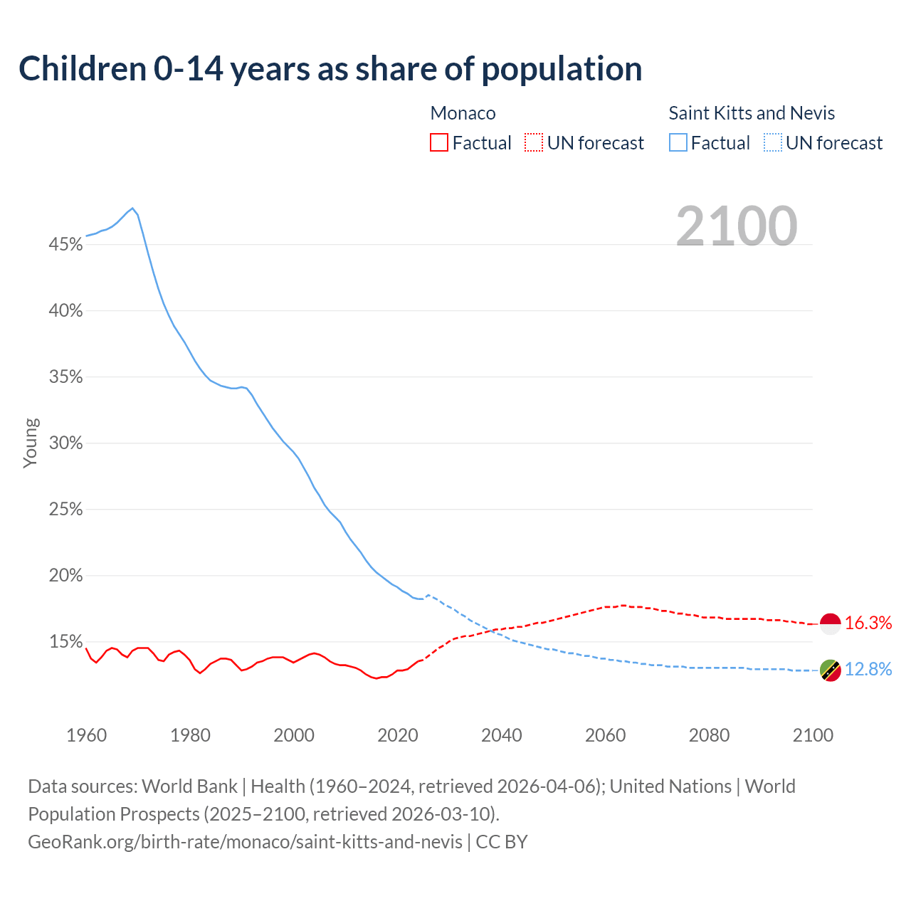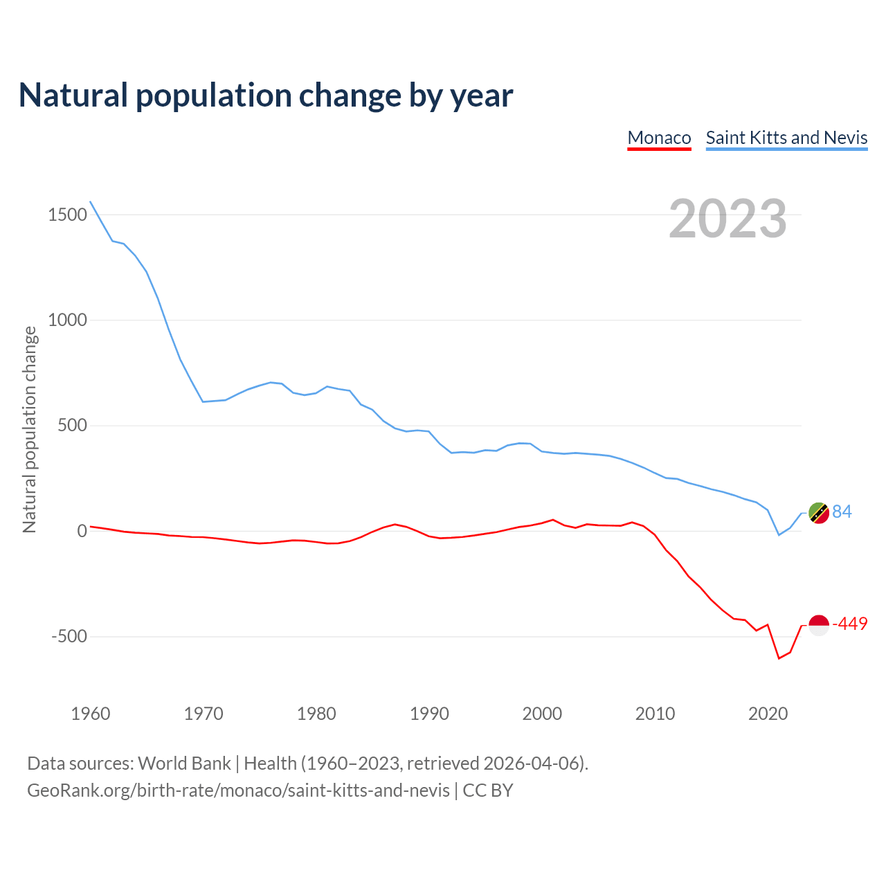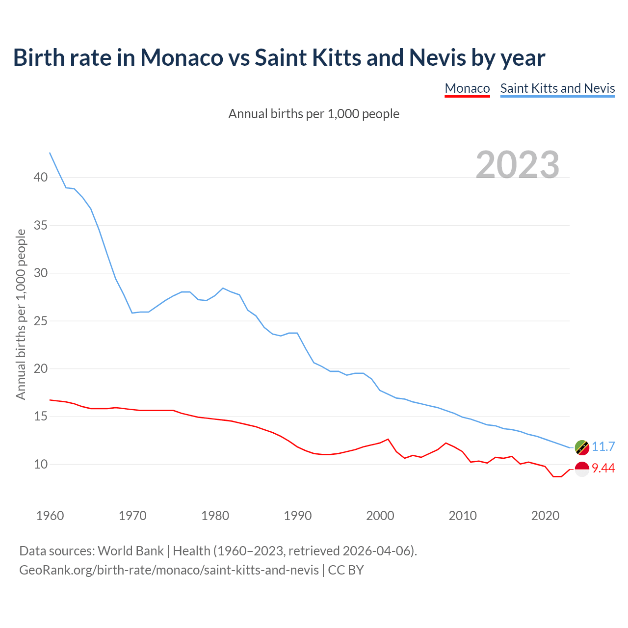 According to the latest available data on birth rates, the fertility rate in Monaco was 2.11 children per woman in 2023, compared to 1.51 in Saint Kitts and Nevis in 2023. The replacement level is considered to be 2.1 children per woman.
