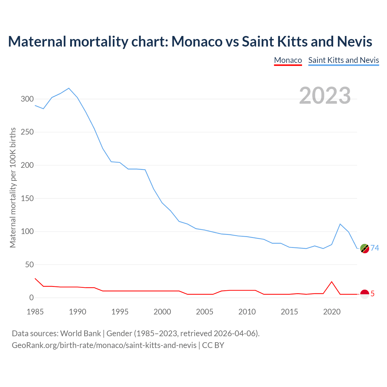 The maternal mortality rate, which is the probability of dying during childbirth or within 42 days of pregnancy termination, is 5 deaths per 100,000 live births in Monaco, compared to 74 deaths in Saint Kitts and Nevis.