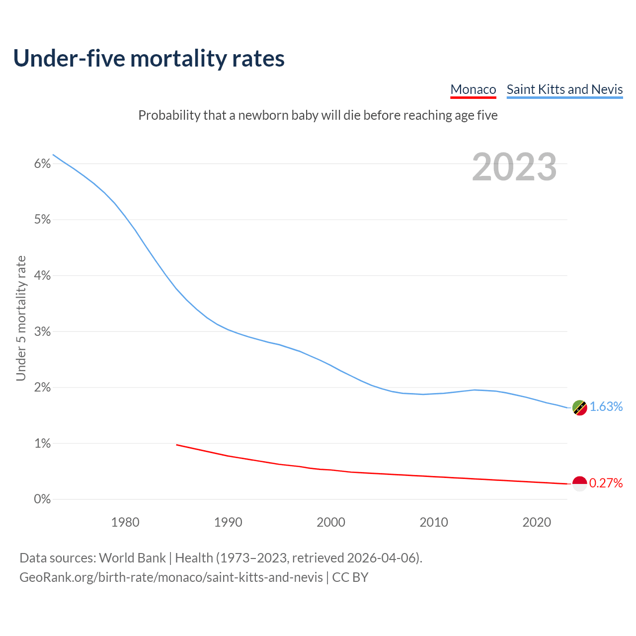 The chance that a newborn baby will die before reaching age five is 0.27% in Monaco and 1.63% in Saint Kitts and Nevis. Above is a chart with historical data on under-five mortality rates.