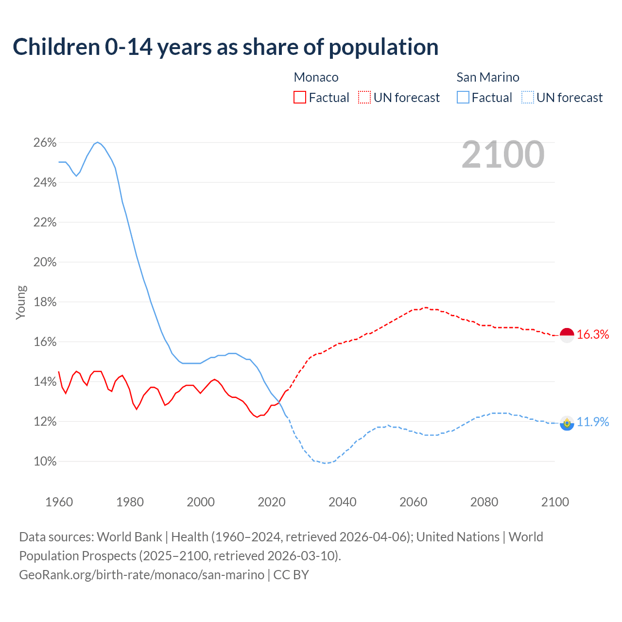 Children aged 0-14 make up 13.5% of the population in Monaco and 12.3% in San Marino in 2024, compared to 12.8% and 16.1% respectively in 1990.