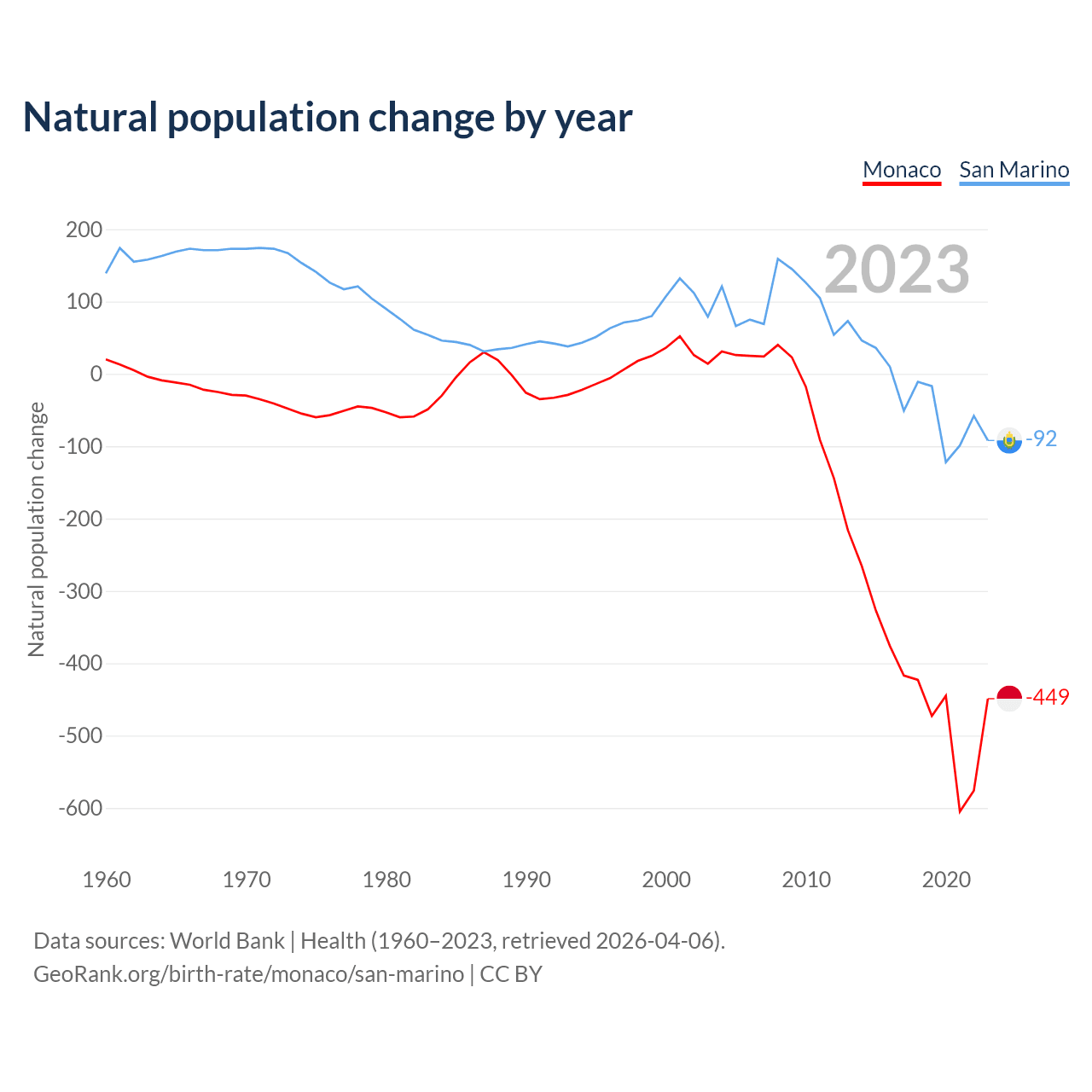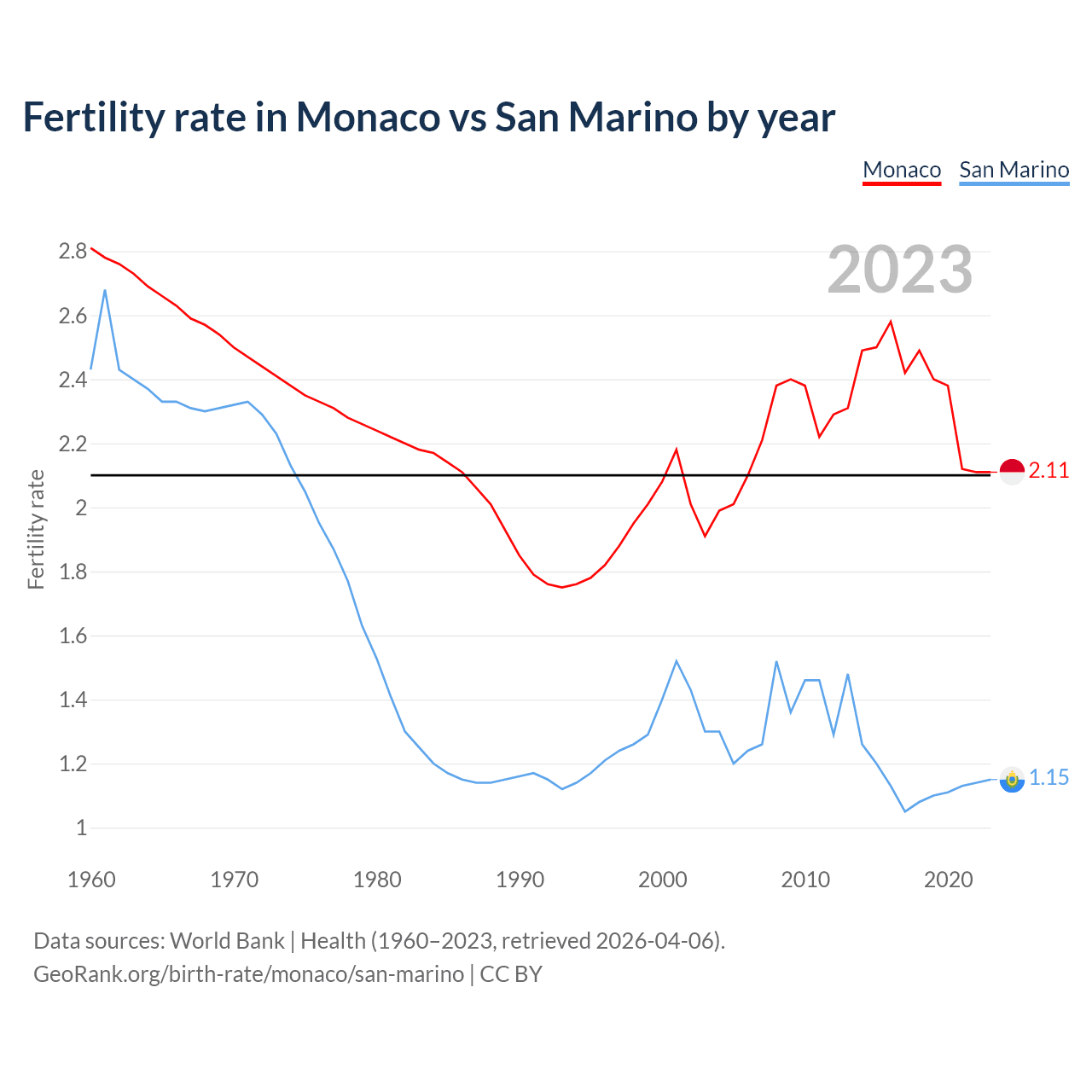 According to the latest available data on birth rates, the fertility rate in Monaco was 2.11 children per woman in 2023, compared to 1.15 in San Marino in 2023. The replacement level is considered to be 2.1 children per woman.