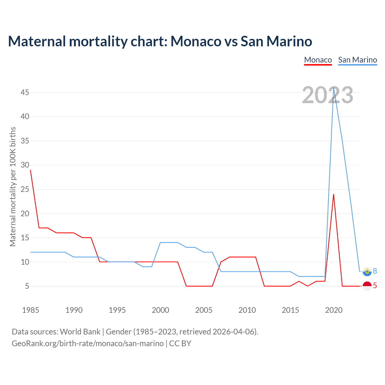 The maternal mortality rate, which is the probability of dying during childbirth or within 42 days of pregnancy termination, is 5 deaths per 100,000 live births in Monaco, compared to 8 deaths in San Marino.