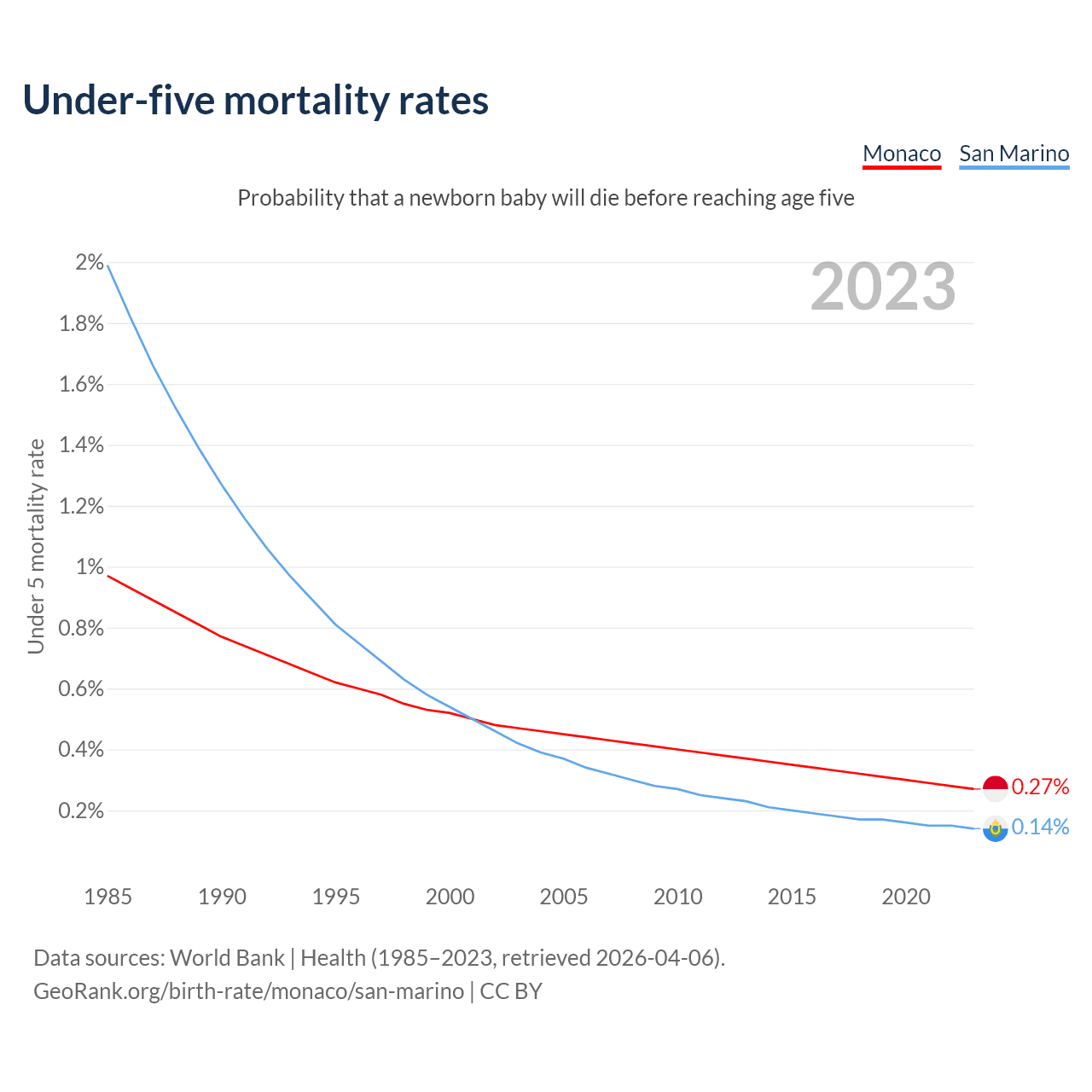 The chance that a newborn baby will die before reaching age five is 0.27% in Monaco and 0.14% in San Marino. Above is a chart with historical data on under-five mortality rates.