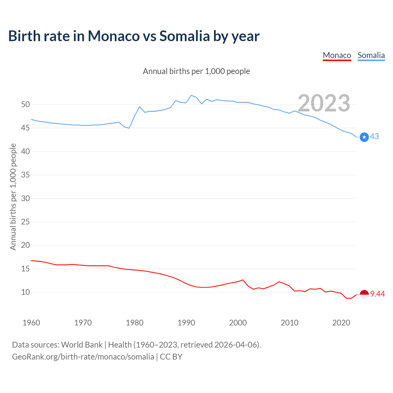 Monaco has an annual birth rate of 9.44 births per 1,000 people, compared to 43 for Somalia. The average number of children a woman is expected to have during her lifetime — the fertility rate, is 2.11 in Monaco and 6.13 in Somalia — 190.6% difference.