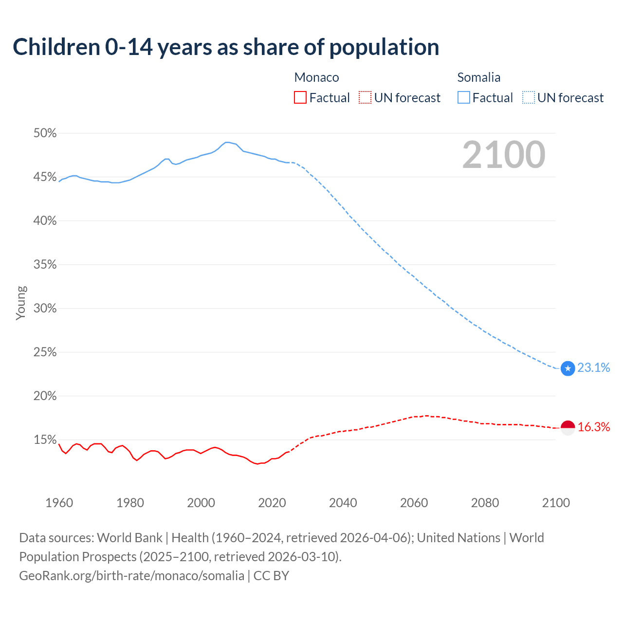 Children aged 0-14 make up 13.5% of the population in Monaco and 46.6% in Somalia in 2024, compared to 12.8% and 47% respectively in 1990.