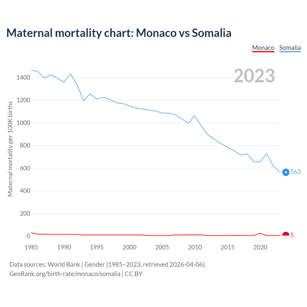The maternal mortality rate, which is the probability of dying during childbirth or within 42 days of pregnancy termination, is 5 deaths per 100,000 live births in Monaco, compared to 563 deaths in Somalia.