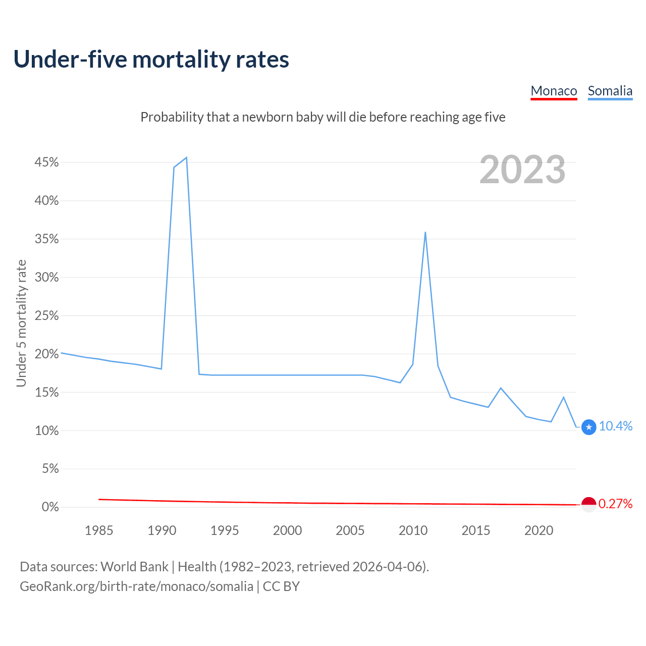 The chance that a newborn baby will die before reaching age five is 0.27% in Monaco and 10.4% in Somalia. Above is a chart with historical data on under-five mortality rates.