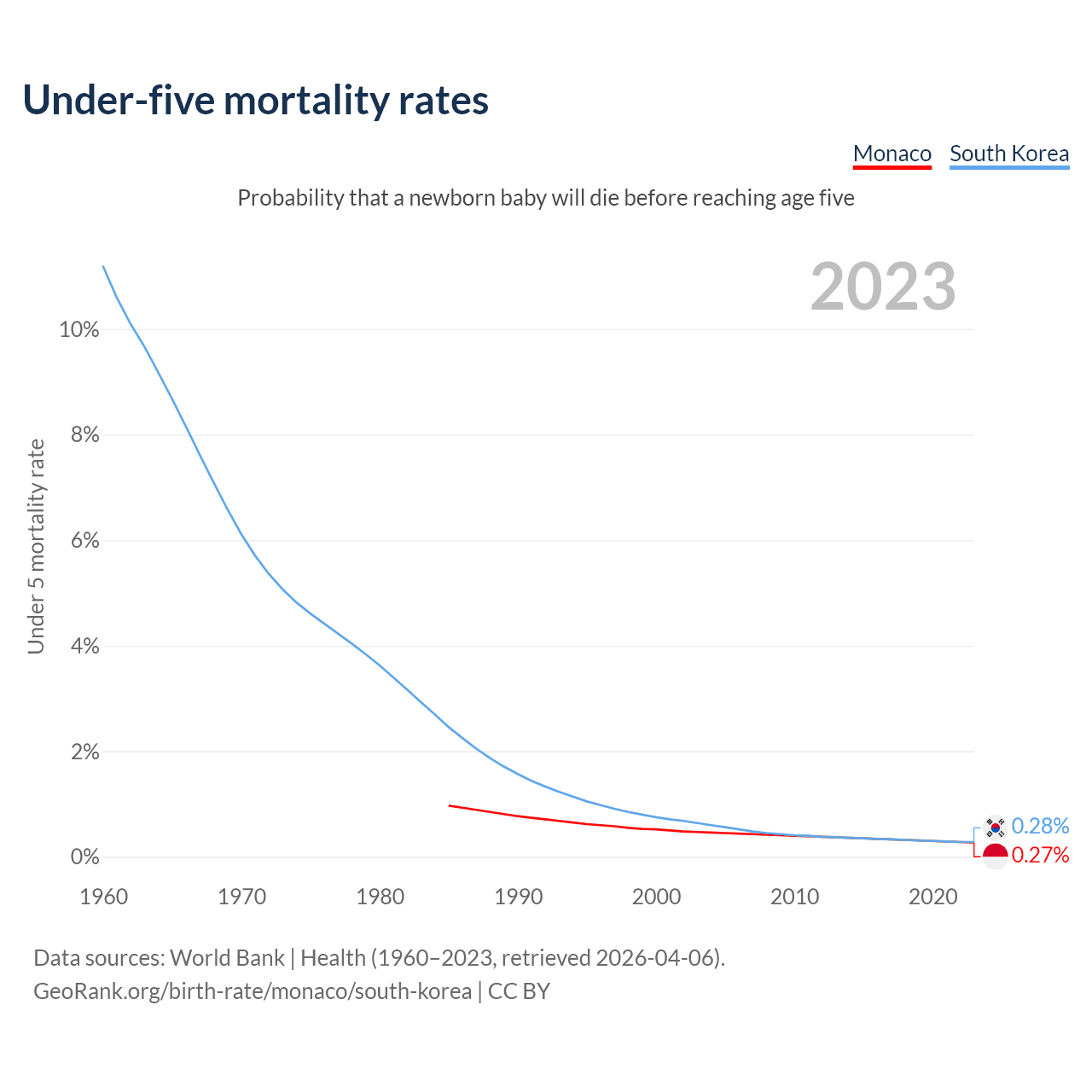 The chance that a newborn baby will die before reaching age five is 0.27% in Monaco and 0.28% in South Korea. Above is a chart with historical data on under-five mortality rates.
