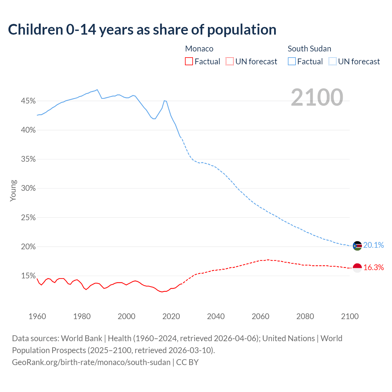 According to the latest available data on birth rates, the fertility rate in Monaco was 2.11 children per woman in 2023, compared to 3.86 in South Sudan in 2023. The replacement level is considered to be 2.1 children per woman.